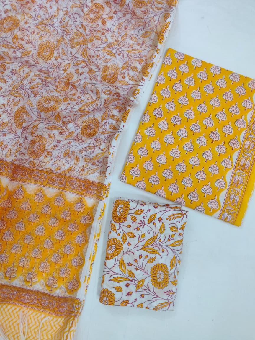 Immerse yourself in the warmth of a sun-drenched garden with our Sunshine Floral Block Print Cotton Dress Material. This fabric embodies the spirit of Indian craftsmanship, showcasing an array of vibrant floral motifs that dance gracefully across a cheerful sunshine yellow backdrop. The intricate block printing technique reveals the skilled hands of artisans, making each piece truly unique.
