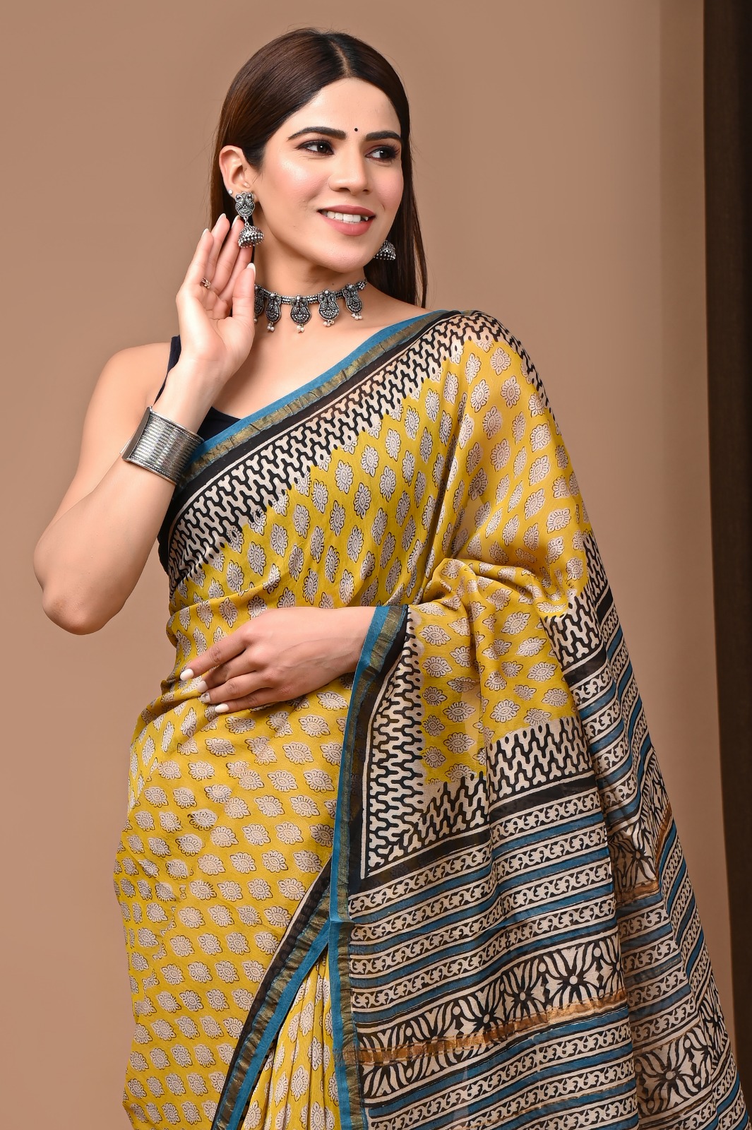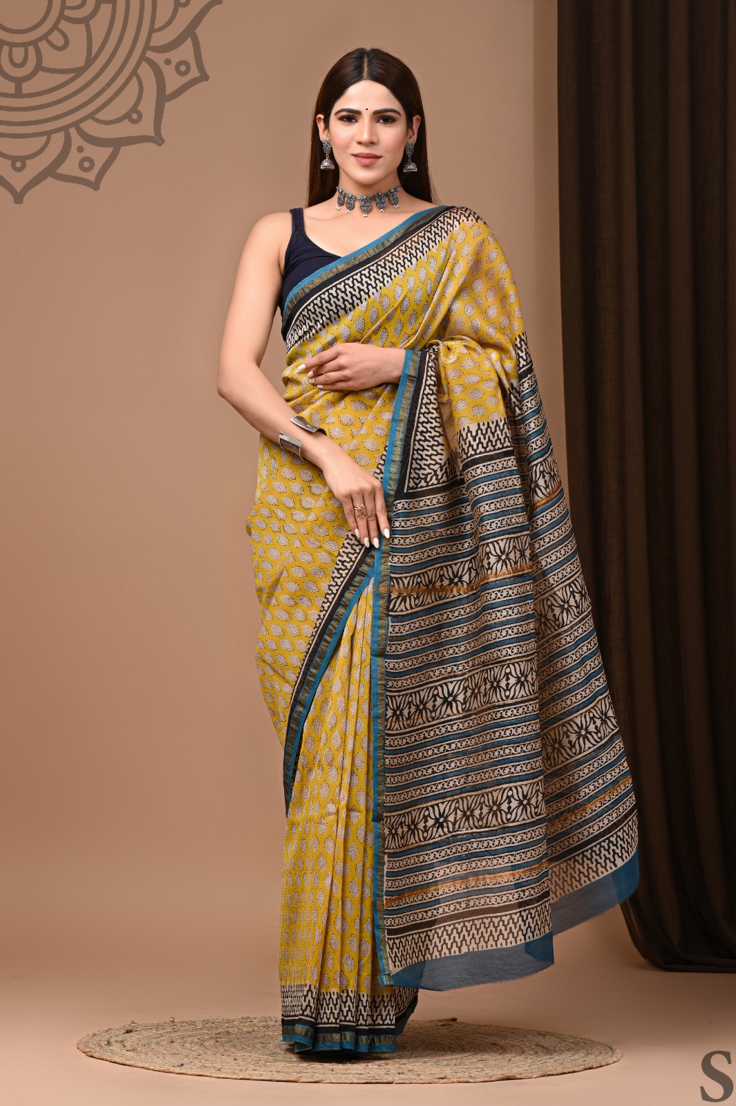 In a stunning display of artisanal excellence, this Chanderi saree drapes gracefully, boasting a vibrant golden yellow foundation adorned with intricate white floral designs. The captivating interplay of deep navy blue and black around the borders adds a sophisticated touch, elevating the overall aesthetic. Each floral motif, meticulously block printed, reflects a deep-rooted tradition that speaks volumes about Indian craftsmanship.