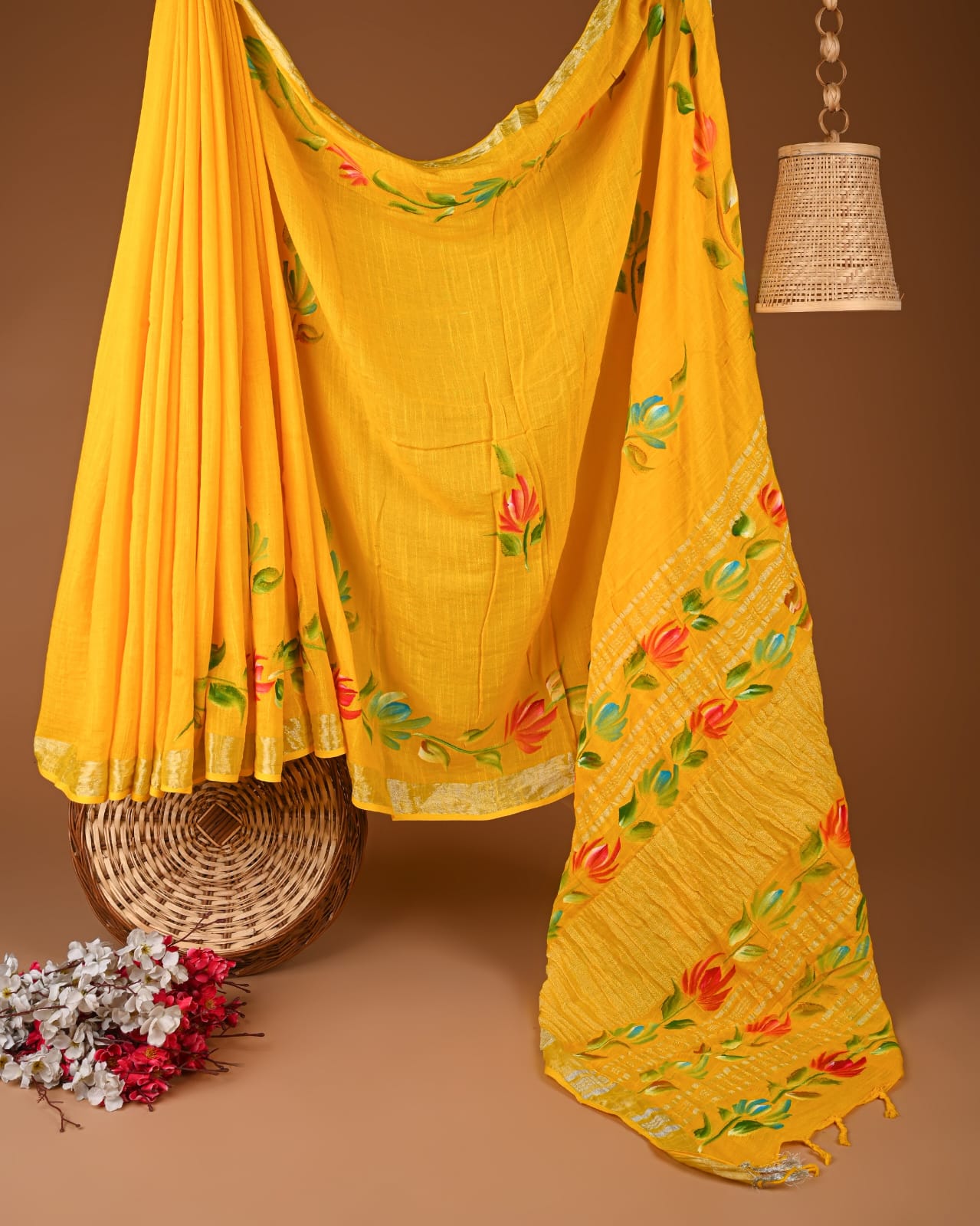 Sunshine Floral Delight is a celebration of vibrant artistry and traditional craftsmanship that reflects the heart of Indian textiles. With a lively sunshine yellow backdrop, this exquisite piece is enlivened by coral pink blooms and emerald green foliage, creating a captivating visual that dances effortlessly across the fabric.
