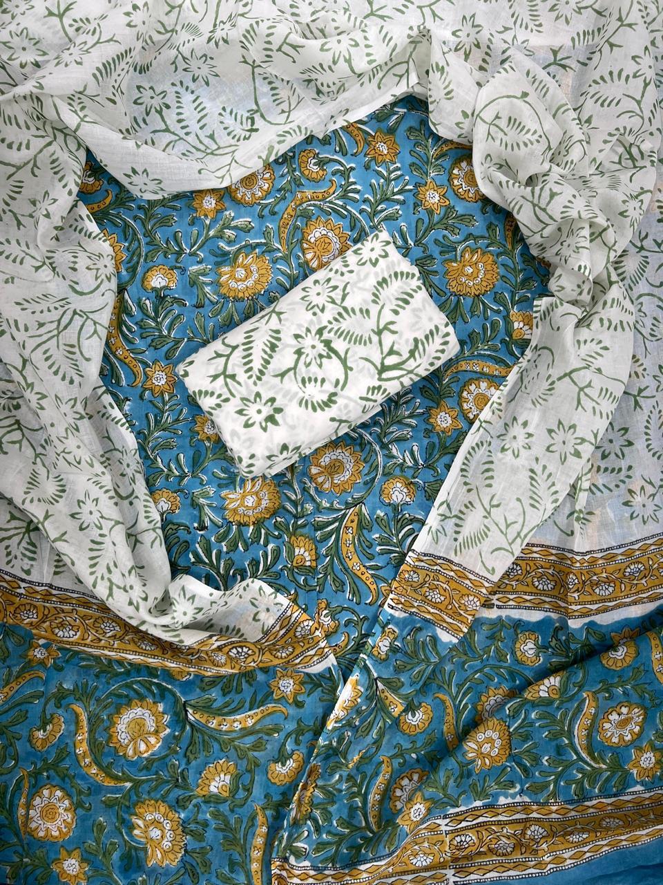 Infuse your wardrobe with the vibrancy of our Sunshine Floral Essence Cotton Suit Set. This exquisite 3-piece ensemble is crafted from 100% pure cotton, offering a breathable and gentle touch against your skin. Each piece is adorned with intricate block prints, celebrating the rich tapestry of Indian craftsmanship.