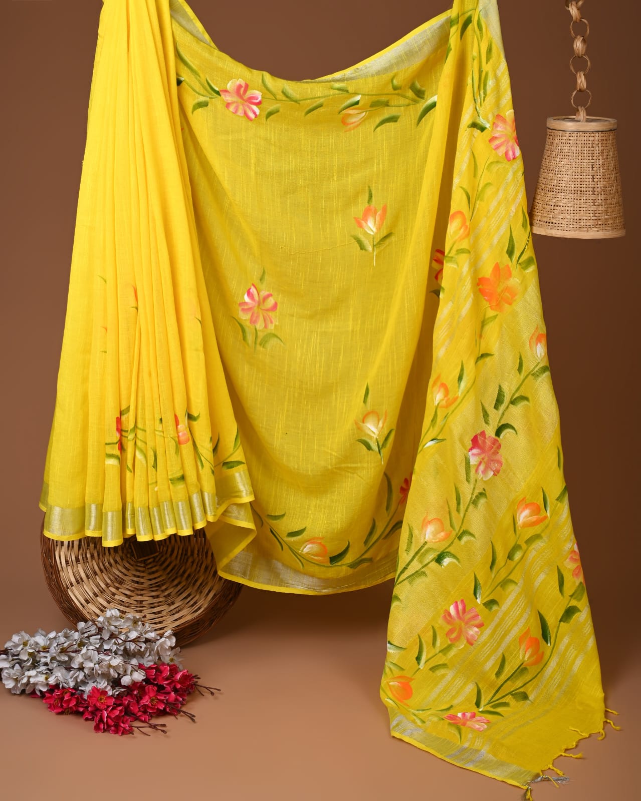 With its lightweight and slightly textured weave, this saree is not just a garment but a canvas of expression, perfect for adding a splash of color to your wardrobe. The hand-painted quality of the floral designs lends a unique character to each saree, making it a one-of-a-kind addition to any ensemble.