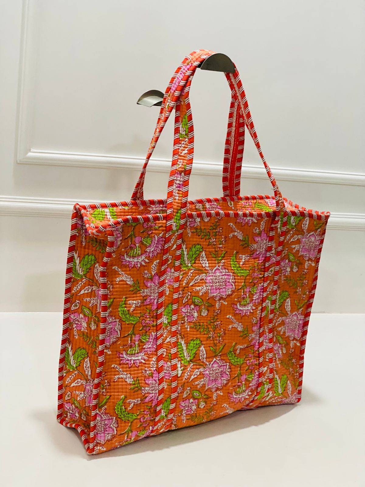 Embrace the unique charm of the Tangerine Blossom Quilted Fabric Tote Bag with Striped Handles. The vibrant tangerine color blends harmoniously with a floral pattern in pink, green, and white, accentuated by red and white striped handles. Each stitch showcases artisan techniques, creating a piece that is both visually appealing and long-lasting. Ideal for daily use, this bag not only adds a pop of color to your ensemble but also offers convenience with its spacious design. Feel the connection to traditional craftsmanship every time you carry this exquisite tote.