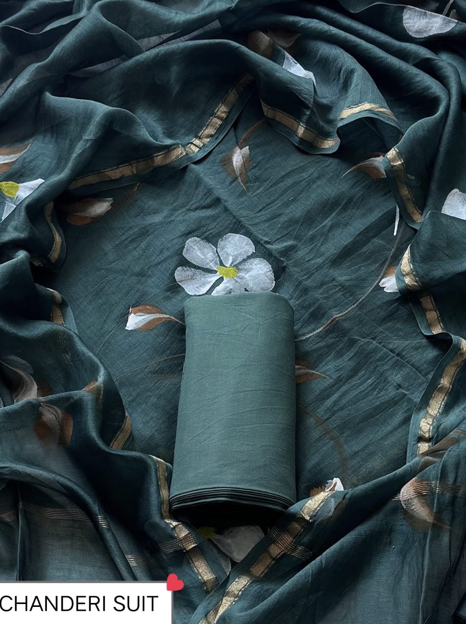 Teal Bloom Chanderi Silk Dress Material Set with Golden Border