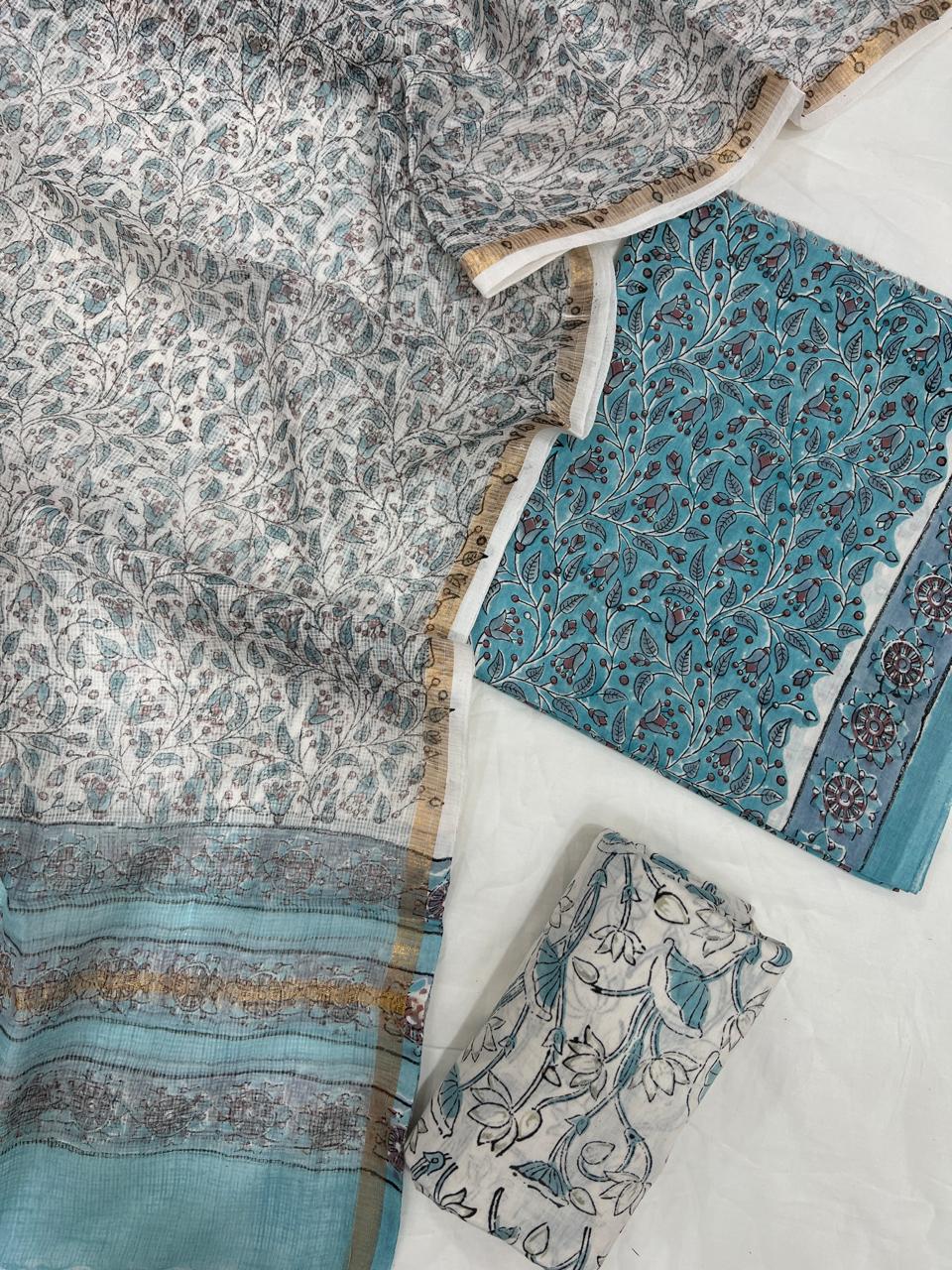 Immerse yourself in the enchanting beauty of our Teal Blossom Floral Cotton Dress Material. Inspired by nature’s delicate patterns, this exquisite fabric features intricate floral motifs elegantly interwoven with whispers of earthy beige and muted coral, all set against a pristine white backdrop. The horizontal stripes in varying shades of teal add a modern twist, creating a captivating harmony.