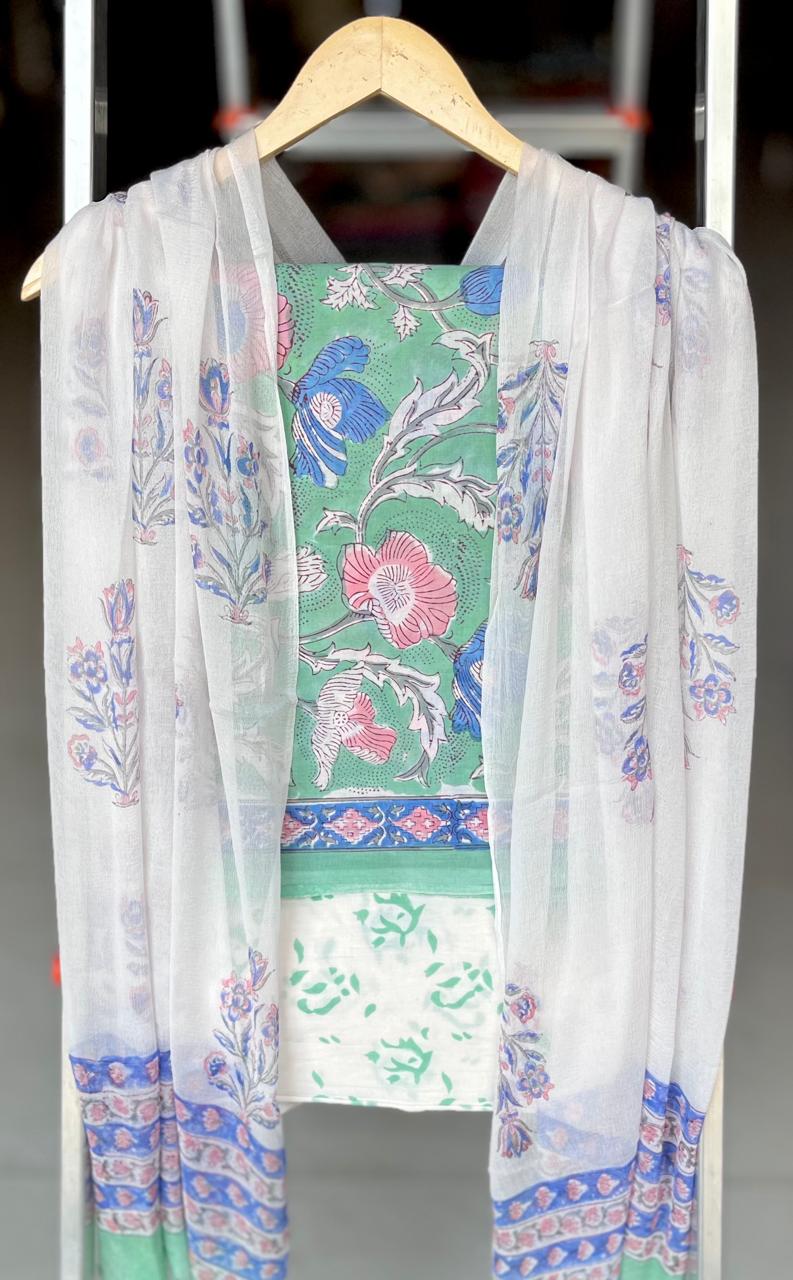 Infuse your wardrobe with the vibrant charm of our Teal Blossom Hand Block Printed Cotton Suit Set. This exquisite ensemble is a celebration of Indian craftsmanship, crafted from 100% pure cotton that promises exceptional comfort and breathability. Each piece is adorned with traditional block prints that evoke a sense of heritage, making it a delightful choice for daily wear, professional settings, or festive gatherings.
