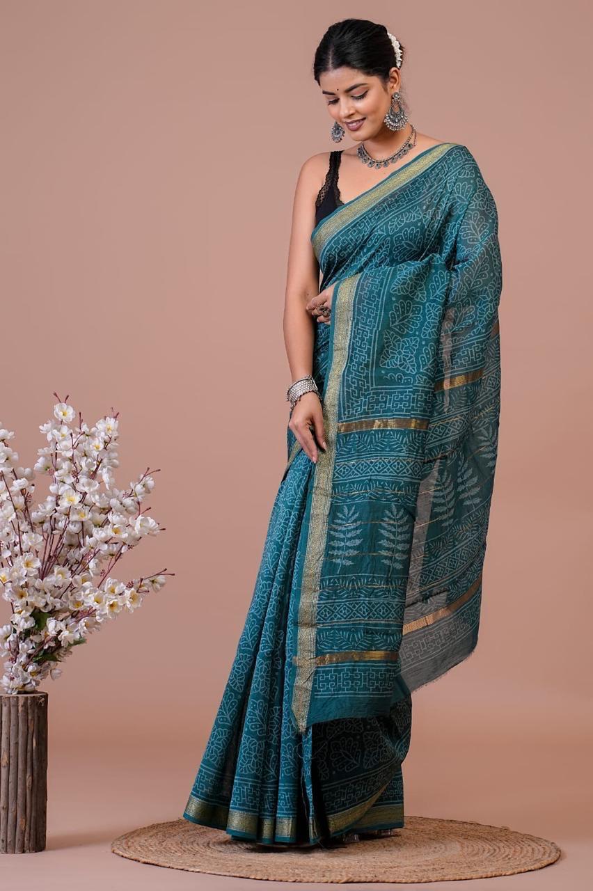 Experience the artistry and tradition woven into every thread of this Teal Blue Maheshwari Silk Saree with Golden Floral Border, a true testament to the rich heritage of Indian hand block printing.