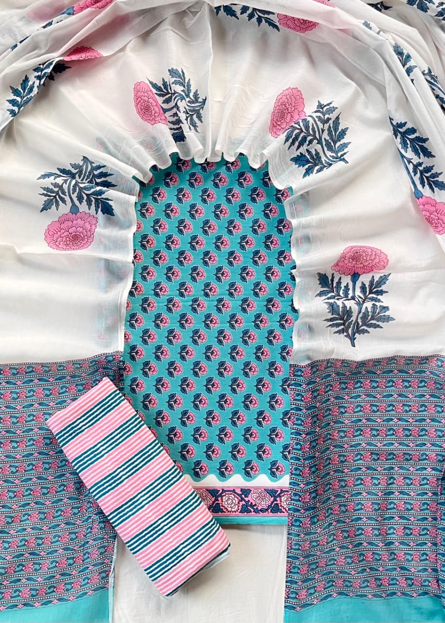 Indulge in traditional elegance with our Teal Floral Hand Block Printed Cotton Suit Set. Crafted with premium cotton fabric, this set features intricate hand block floral prints on a teal blue base, exuding artisanal charm. The lightweight and comfortable material make it perfect for all-day wear. The set includes a top, bottom, and dupatta, offering a complete outfit solution. Elevate your ethnic wardrobe with this exquisite ensemble.