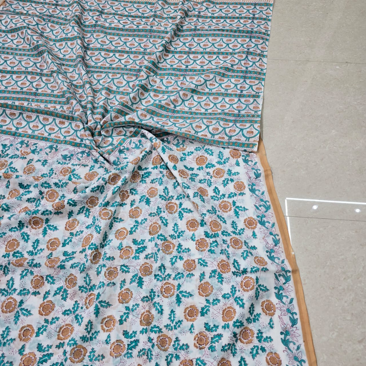 Teal Floral Hand Block Printed Mulmul Saree Set