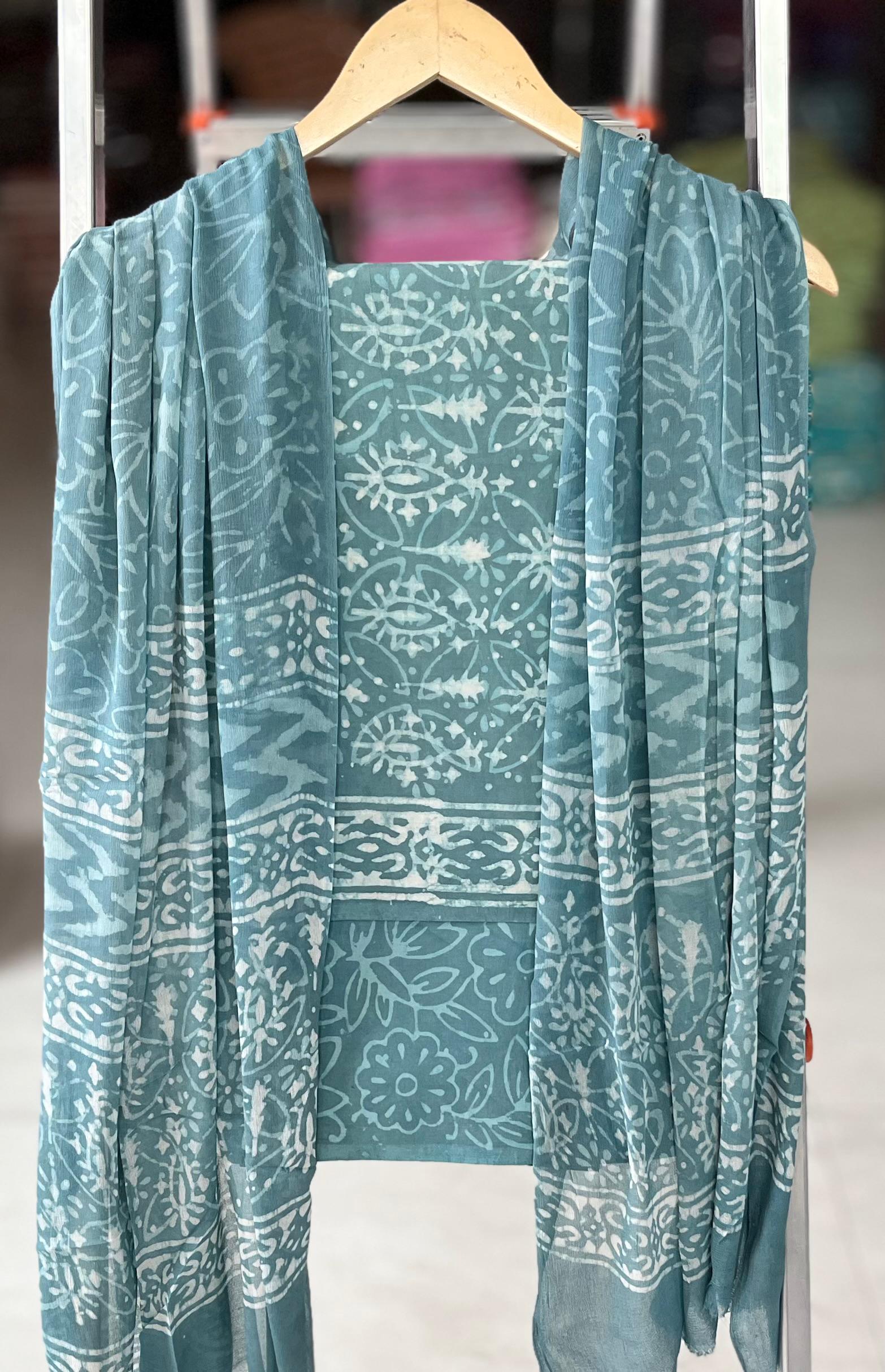 Crafted from 100% pure cotton, this three-piece unstitched dress material not only breathes but also carries the essence of traditional Indian craftsmanship. The soft, airy fabric drapes beautifully, allowing for ease of movement while you go about your day.