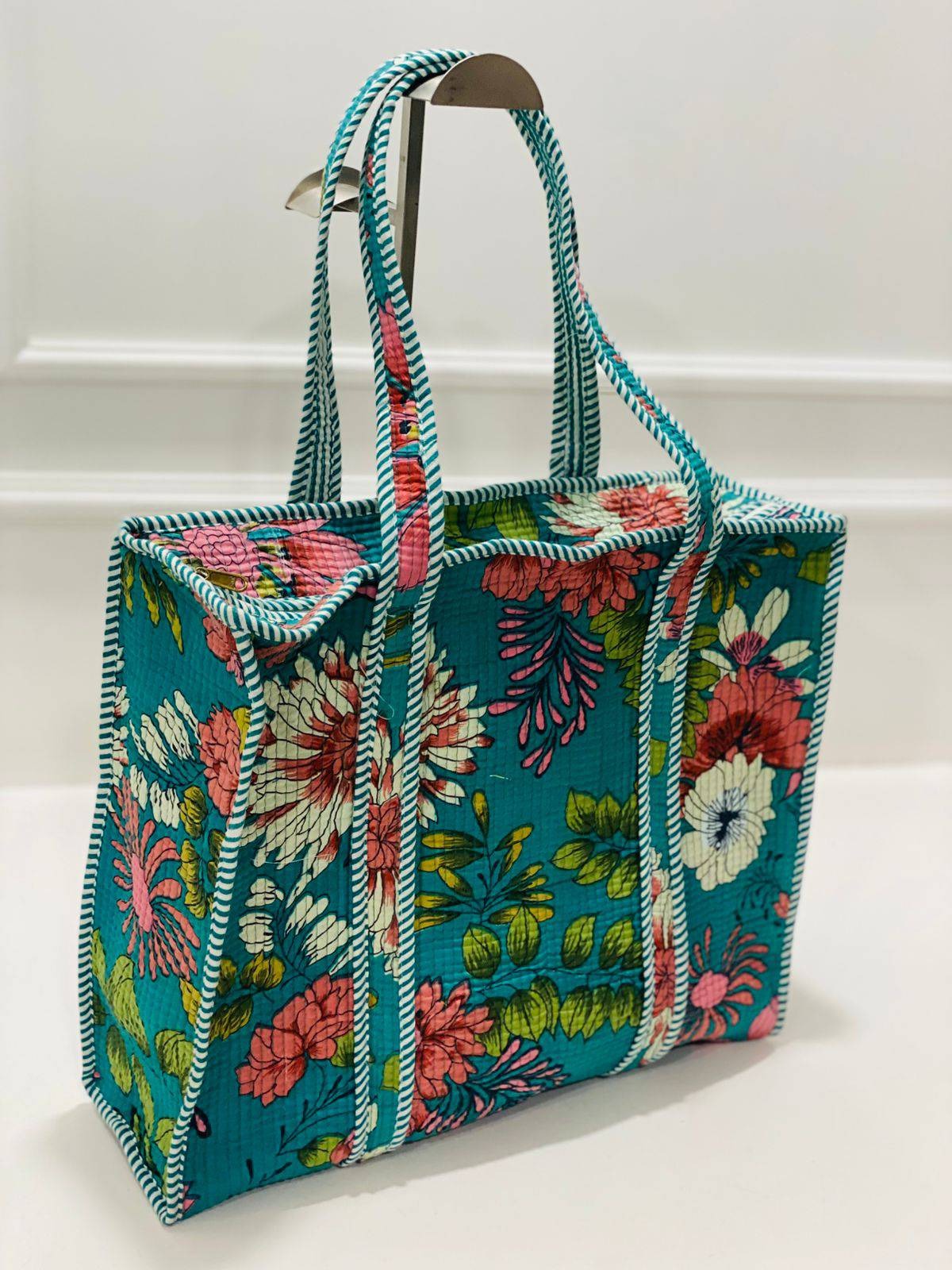 Elevate your accessory game with the Teal Floral Harmony Quilted Tote Bag in Striped Trim and embrace the beauty of traditional Indian block printing.