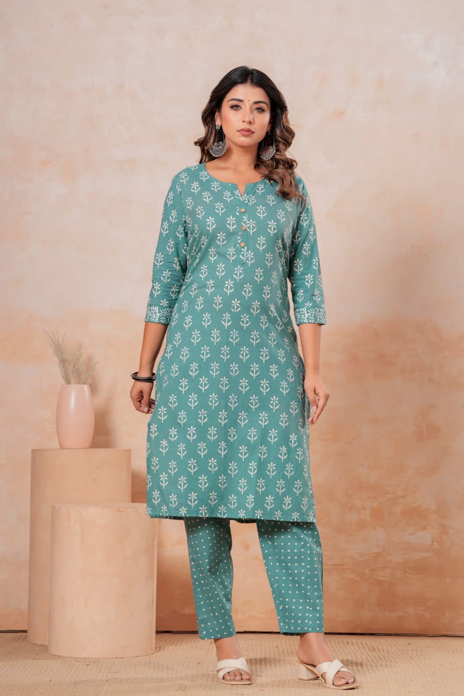 Discover the feeling of timeless elegance with our Teal Floral Whisper Cotton Kurti paired with playful polka pants. This artisan-crafted ensemble showcases intricate floral motifs that dance gracefully across a serene teal canvas, embodying the spirit of traditional craftsmanship fused with contemporary styling. The relaxed yet refined silhouette, featuring a classic round neckline and three-quarter sleeves, makes it an ideal choice for casual meet-ups or semi-formal gatherings.