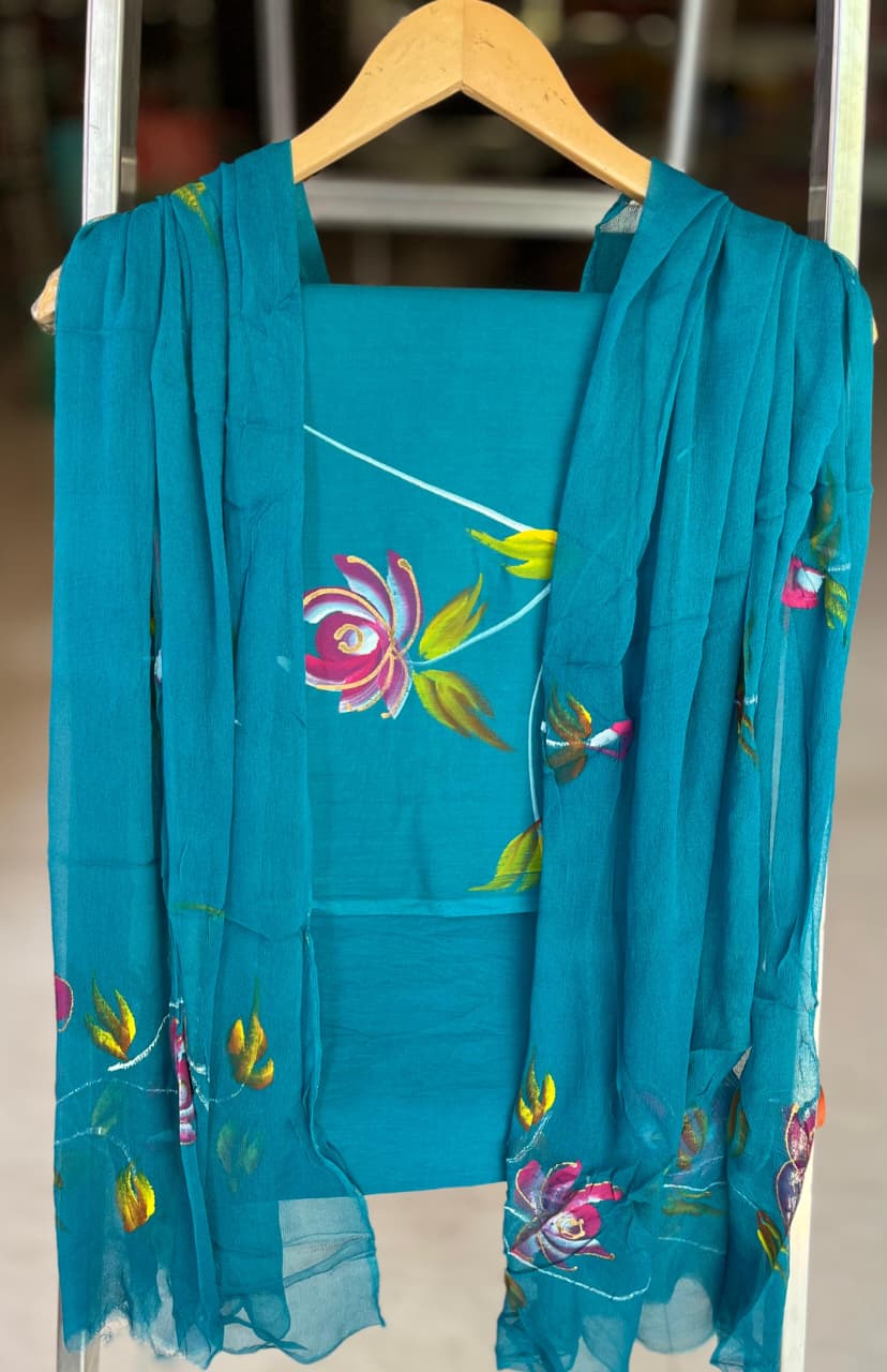 Crafted from 100% pure cotton, the fabric offers a lightweight drape that ensures comfort, while the chiffon dupatta adds a graceful touch. This unstitched set grants you the freedom to tailor it to your unique style, making it a cherished addition to your wardrobe.