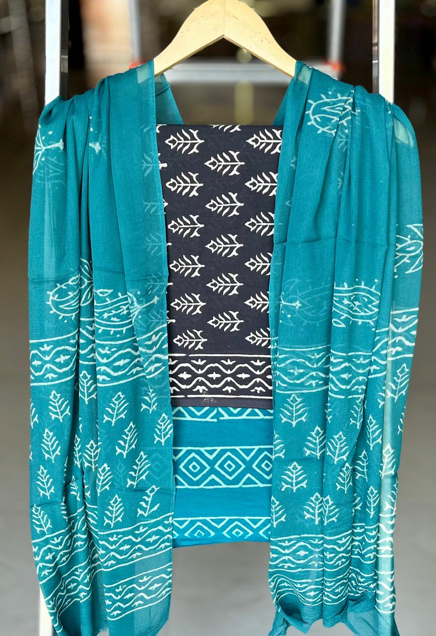 Immerse yourself in the rich traditions of Indian textile artistry with this Teal Geometric Elegance Cotton Suit Set. Each piece is artisan-crafted, showcasing intricate block prints that tell a story of heritage and dedication. The rich teal fabric, adorned with geometric motifs, seamlessly blends with the subtle navy backdrop, creating a striking visual appeal.