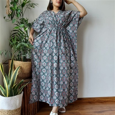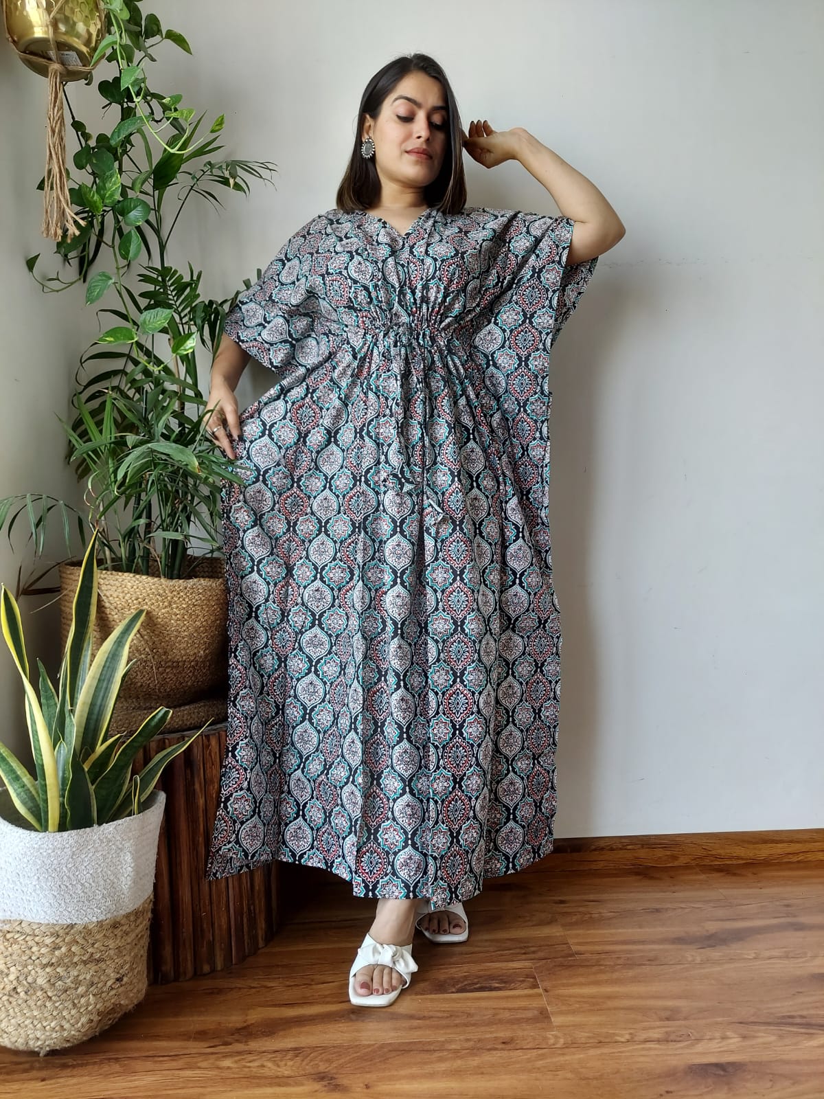 Elevate your wardrobe with this exquisite Teal Geometric Hand Block Printed Cotton Kaftan Dress from Blockart. Crafted from 100% pure cotton, this free-size dress features a V-neckline, wide sleeves, and a cinched waist for a comfortable and adjustable fit. The intricate geometric and floral pattern adds a touch of artisanal charm, making it perfect for casual and lounge wear. Embrace the artistry of hand block printing with this premium, lightweight, and soft kaftan dress that exudes traditional Indian craftsmanship.