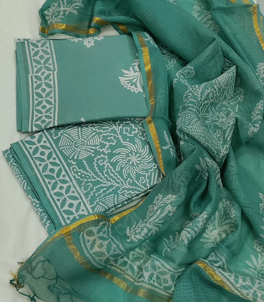Teal Green Hand Block Printed Cotton Suit with Kota Doria Dupatta