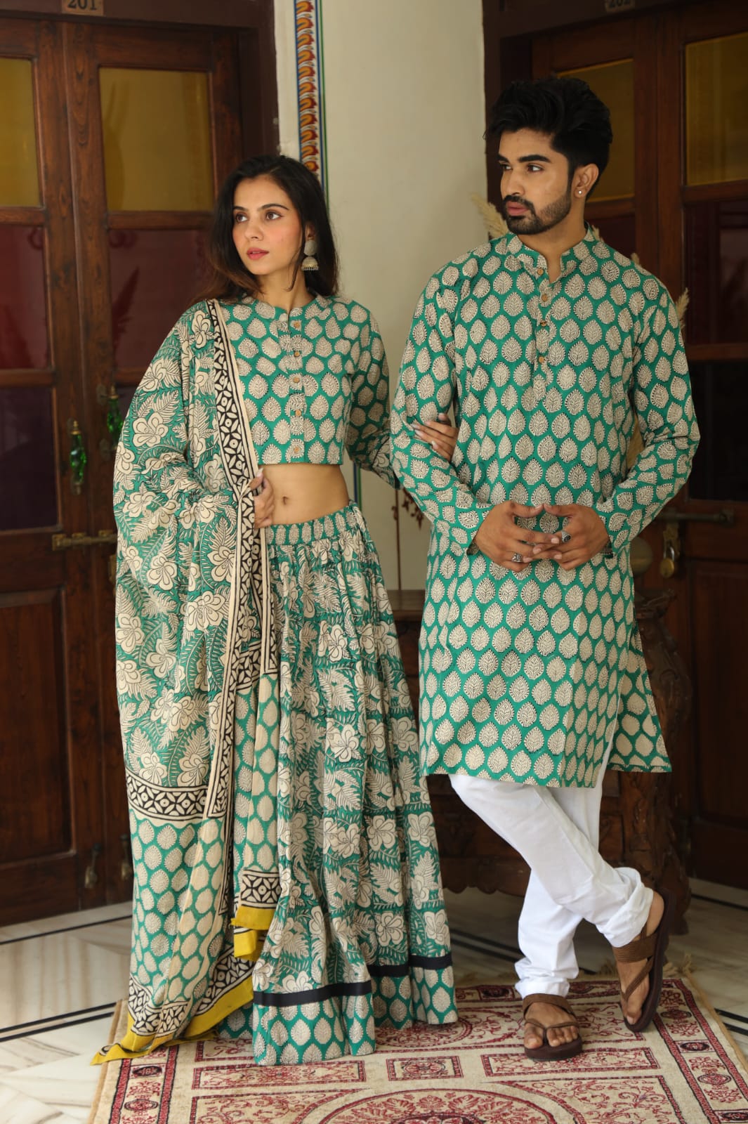 Elevate your festive look with our handcrafted couple ensemble. Expertly crafted from premium cotton, this set features intricate leaf motif patterns. The woman's attire includes a crop top with a mandarin collar, a floral patchwork skirt, and a dupatta with a contrasting border. The man's kurta complements with a similar leaf motif design. Experience comfort, style, and tradition in every stitch of this artisanal creation.