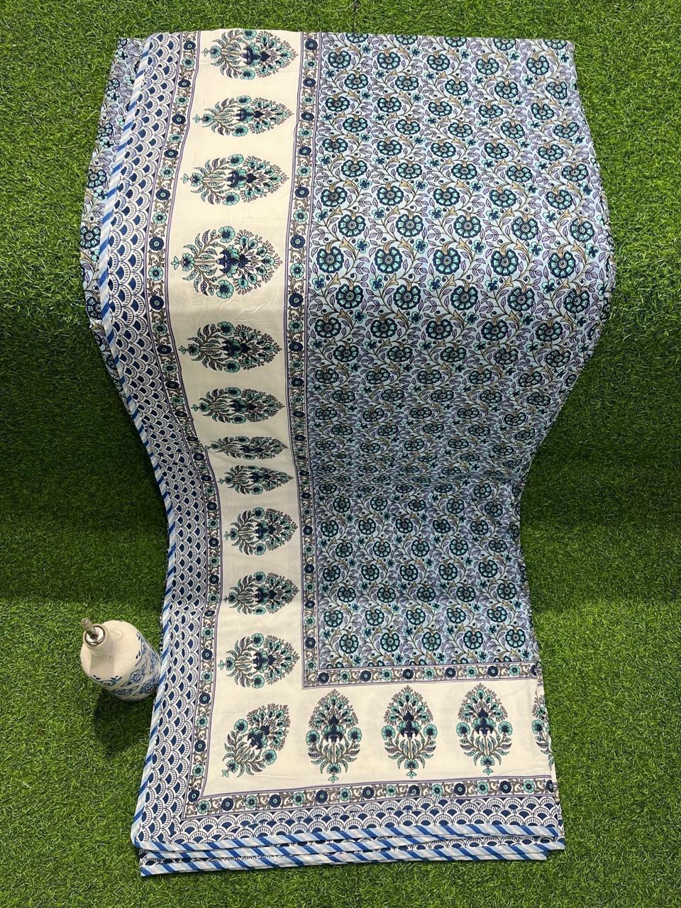 Featuring a delightful interplay of floral and paisley designs, this dohar brings together the elegance of traditional motifs with a modern twist. The soothing teal backdrop is adorned with intricate patterns that tell stories of heritage, while the reversible feature allows for effortless styling versatility.