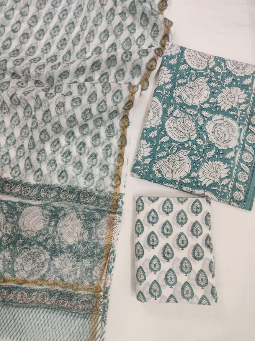 Immerse yourself in the intricate artistry of our Teal Paisley Floral Cotton Dress Material, where rich teal serves as a sophisticated canvas for a cascade of charming floral and paisley motifs. Each piece is artisan-crafted with attention to detail, showcasing a balance of tradition and contemporary flair.