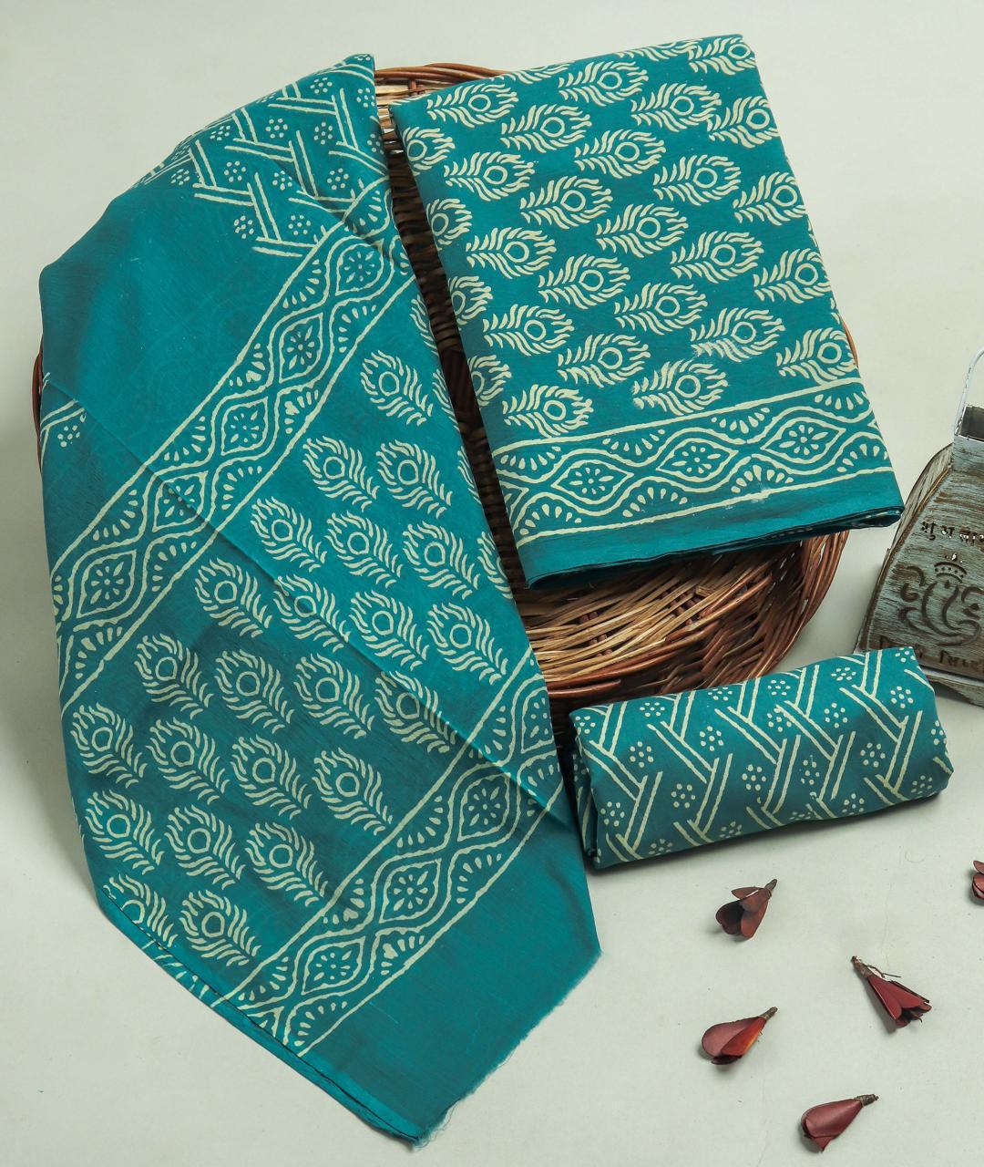 Teal Peacock Feathers Hand Block Printed Cotton Suit Set