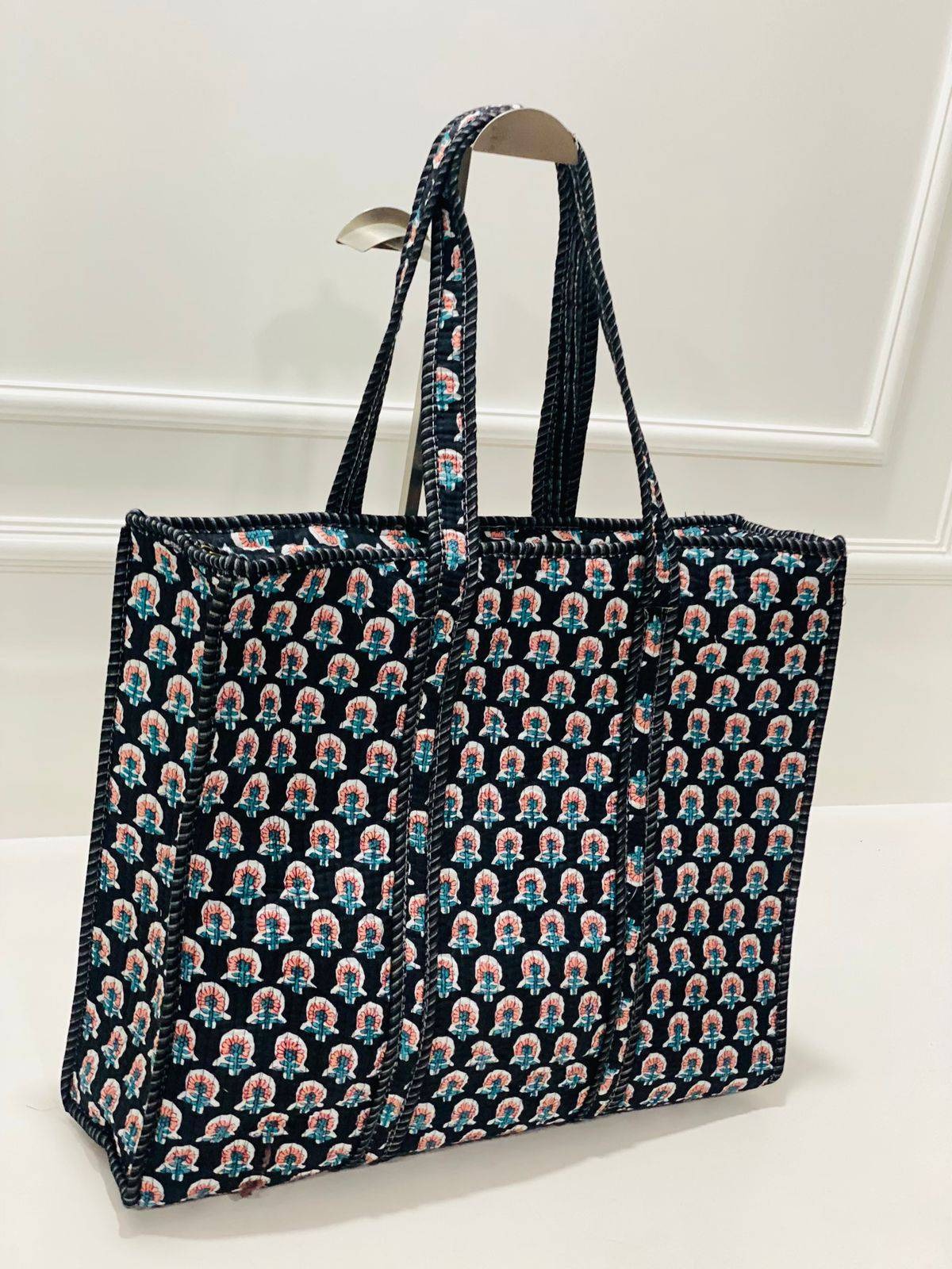 Immerse yourself in the artisan's inspiration with this Teal Pink Floral Block Print Quilted Cotton Tote Bag. The intricate printing technique showcases small floral motifs in shades of pink, white, and teal, reflecting traditional Indian craftsmanship. The quilted texture adds a touch of elegance while ensuring lasting wear. Embrace the versatility of this medium to large-sized tote, perfect for carrying your essentials with style. Explore different ways to wear it, from a casual shopping companion to a statement beach tote, connecting to the rich heritage of Indian textile traditions.