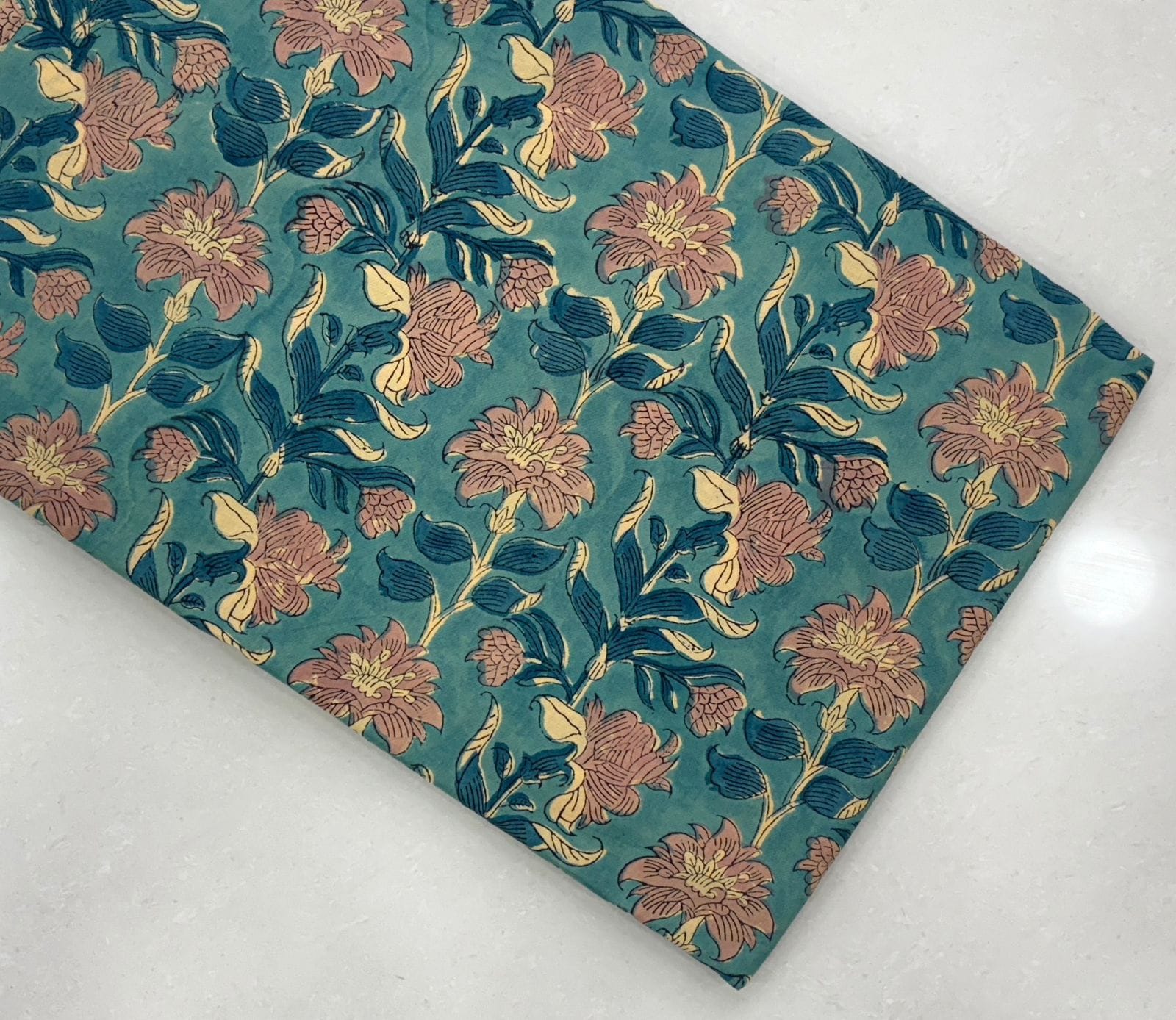 In this delightful artisan fabric, a rich teal base serves as the backdrop for blooming rose pink flowers, kissed with accents of sunny yellow. Each print tells a story of craftsmanship, intricately designed with a hand block technique that evokes the essence of traditional artistry.