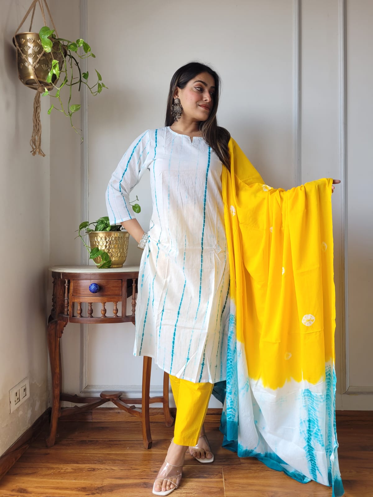 Step into a world where tradition meets contemporary flair with our Teal Striped Ombre Cotton Suit Set. This exquisite ensemble captures the essence of Indian artistry through its meticulously hand block printed kurti, showcasing a refined striped pattern in soothing teal against a soft white backdrop. The vibrant mustard yellow pants provide a striking contrast, while the matching dupatta, adorned with a delicate ombre effect transitioning from sunshine yellow to light blue, adds a touch of elegance.