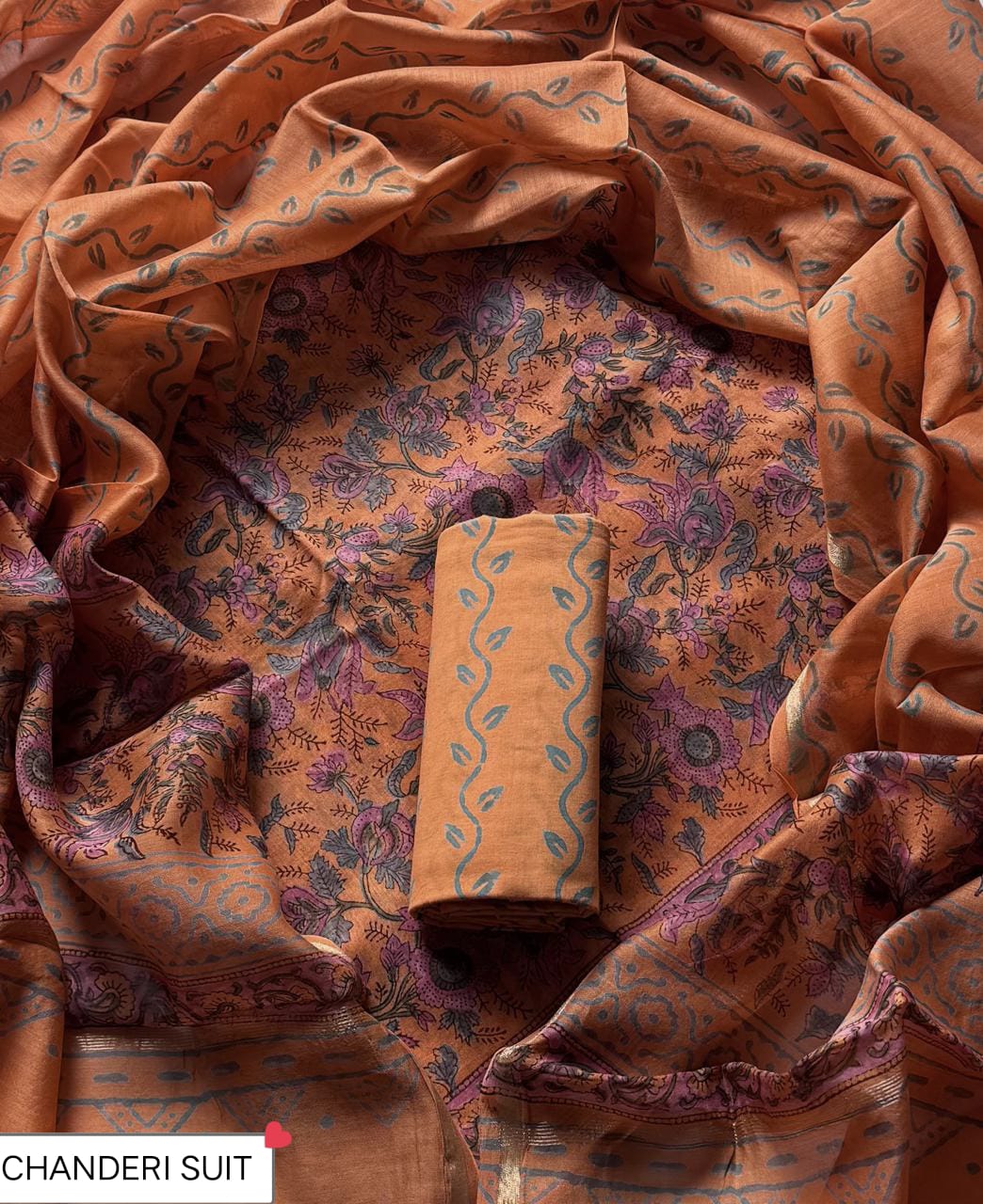 Immerse yourself in the artisan's vision with this Chanderi silk ensemble inspired by nature's beauty. Crafted using traditional hand block printing techniques, this ensemble features intricate floral and leaf patterns in shades of purple, grey, and black, set against a warm terracotta backdrop. The lightweight and sheer Chanderi silk fabric lends a luxurious feel, making it ideal for various occasions. Explore different styling options with the versatile dupatta and experience the heritage of Indian textile craftsmanship in every detail.