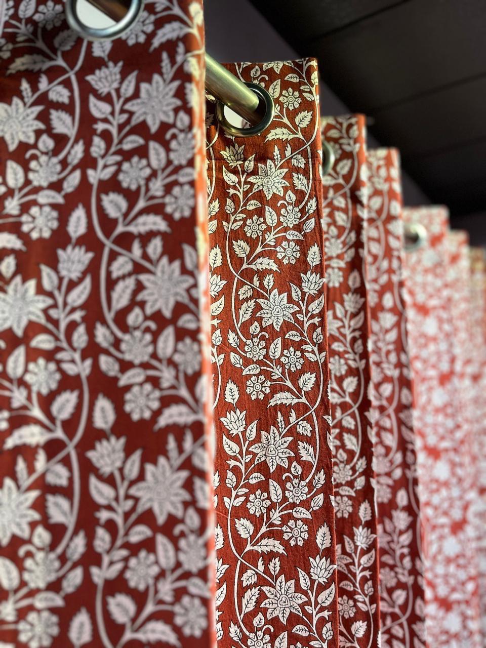 Let the warmth of tradition embrace your home with these Terracotta Floral Delight Cotton Curtains. Each piece tells a story, intricately hand block printed by skilled artisans, showcasing a flowing arrangement of floral motifs that dance in harmony across a rich terracotta backdrop. This unique creation brings a touch of nature's beauty indoors, transforming your space into a serene retreat.