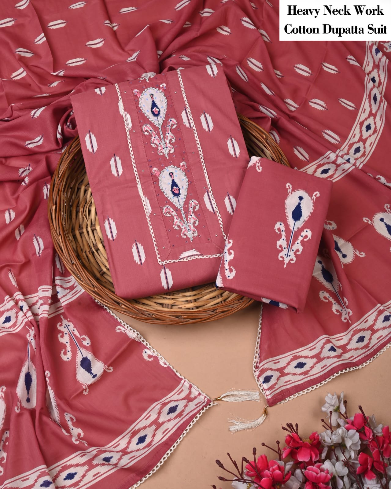 Are you on the lookout for a piece that seamlessly fuses traditional craftsmanship with contemporary elegance? This terracotta suit set showcases an enchanting mix of paisley and floral designs, celebrating the beauty of hand block printing.