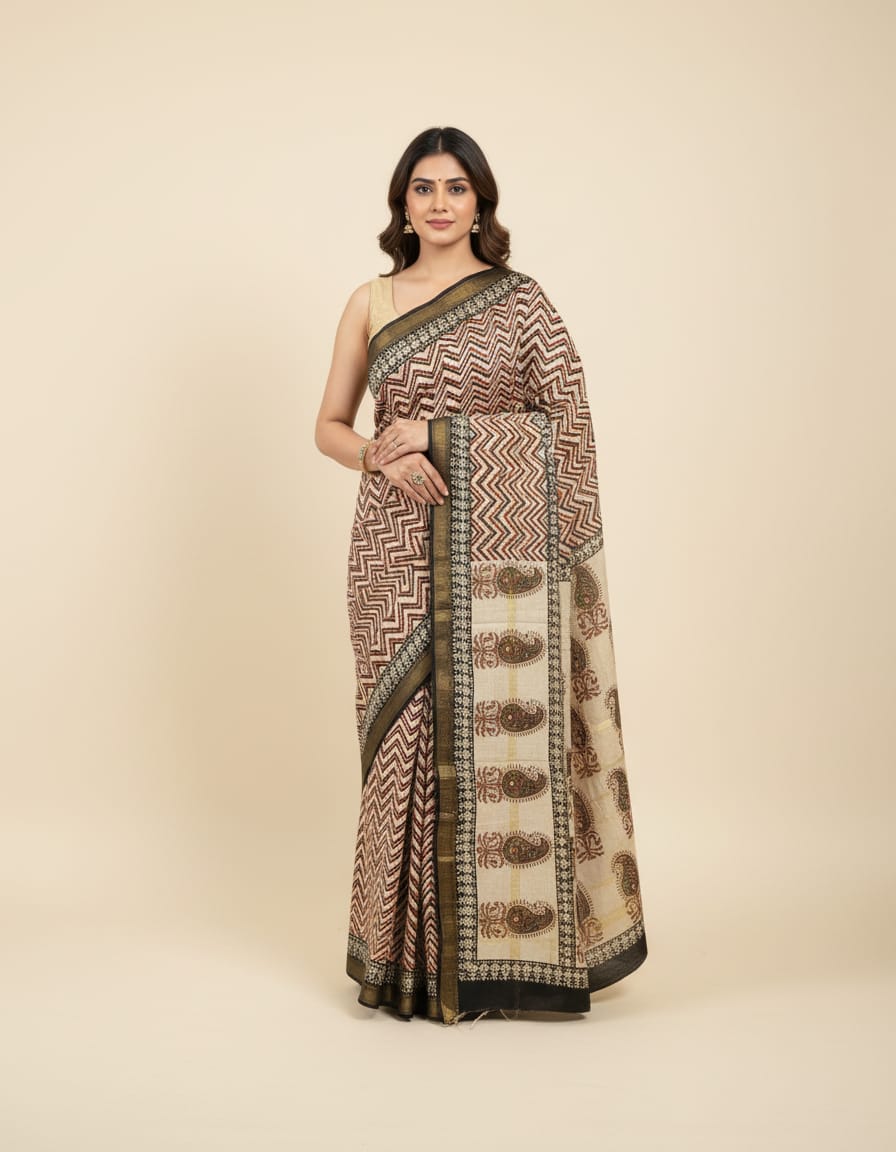 Step into a narrative woven with rich tradition and artistry with our Terracotta Zigzag Bagru Hand Block Print Saree. This exquisite piece reflects the authentic craft of Indian textiles, showcasing a harmonious blend of vibrant terracotta and intricate paisley motifs set against a soft off-white backdrop.