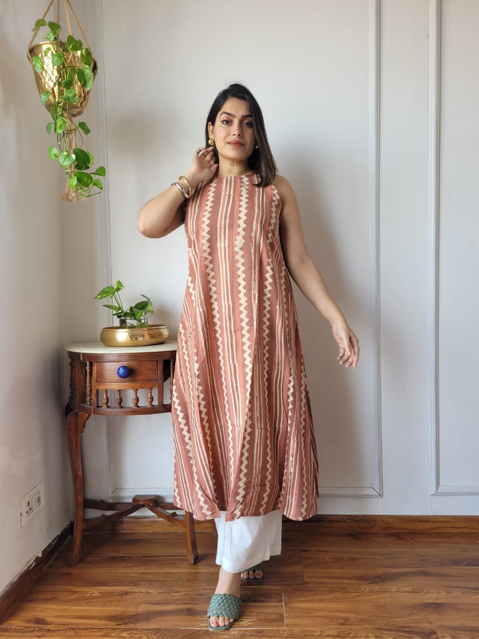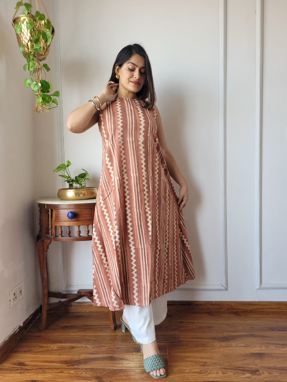 Embark on a journey of traditional artistry with our Terracotta Zigzag Striped Cotton A-Line Kurta Set. Inspired by Indian craftsmanship, this set showcases intricate hand block printing techniques in shades of terracotta and beige. The lightweight and breathable cotton fabric ensures comfort and style. Explore different styling options with this versatile set that pays homage to cultural heritage.