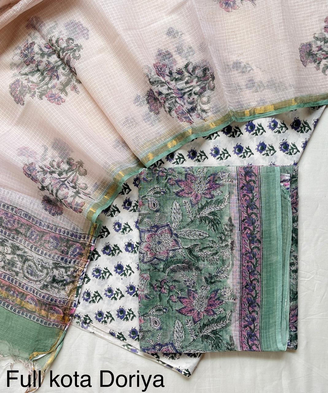 Embrace the timeless beauty of Indian heritage with this traditional suit crafted from pure Kota Cotton. This fabric is celebrated for its lightweight, breathable, and slightly crisp texture, characterized by the distinct square-check weave, making it ideal for everyday comfort. The suit features authentic traditional block prints, meticulously hand-stamped onto the fabric using carved wooden blocks. These designs often draw inspiration from historical Indian art, including intricate floral patterns, paisleys, and geometric motifs, typically in earthy or contrasting colors. This ensemble is a classic choice for daily wear, cultural events, or for those who appreciate handcrafted elegance and comfort.