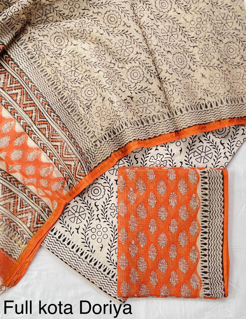 Immerse yourself in cultural richness with this traditional suit, beautifully crafted from silk cotton Kota fabric and adorned with authentic handblock prints. The silk cotton blend provides the breathable comfort of cotton with the soft drape and subtle sheen of silk, while maintaining Kota's unique woven texture. The traditional handblock prints are the highlight, showcasing intricate patterns – often inspired by historical Indian art, nature, or geometric motifs – meticulously stamped by skilled artisans using carved wooden blocks. These prints typically use rich, earthy, or contrasting colors, making each piece a unique work of art. This suit is perfect for cultural events, festive occasions, or for those who appreciate handcrafted elegance.