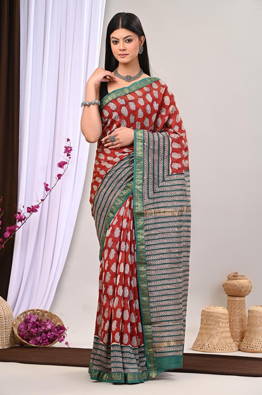 Step into timeless elegance with this traditional Maheshwari silk saree, adorned with exquisite handcrafted block prints. Each motif is meticulously created by skilled artisans using age-old printing techniques that preserve India’s rich textile heritage. The silky texture and delicate sheen of Maheshwari silk provide a luxurious feel, making it both comfortable and glamorous. The harmonious blend of colors and patterns gives the saree a regal charm, suitable for weddings, festive celebrations, or cultural events. Accompanied by a matching blouse piece, this saree offers a complete and coordinated look. Lightweight and breathable, it allows for effortless movement while maintaining a polished, sophisticated appearance. Perfect for those who value both tradition and style, this Maheshwari silk saree is more than just attire — it’s a wearable work of art that tells the story of heritage, skill, and beauty.