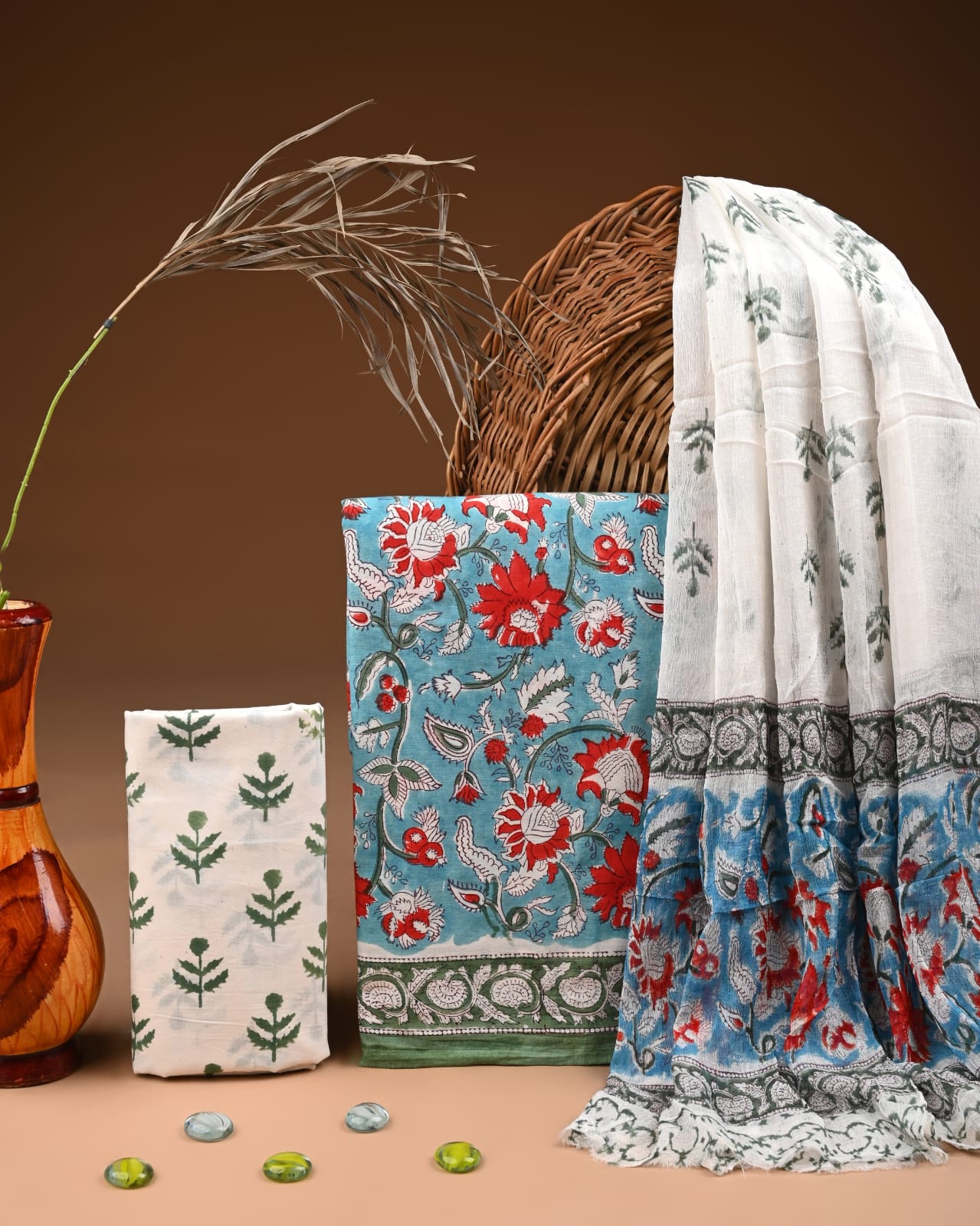 Embrace the vibrant allure of artisanal craftsmanship with our Turquoise Bloom Hand Block Cotton Suit Set. Each piece tells a story, showcasing the intricate work of skilled artisans who pour their heart and soul into every stitch. The energizing turquoise fabric beckons you with its lively crimson floral patterns, evoking a sense of joyous celebration and connection to natureβs beauty.