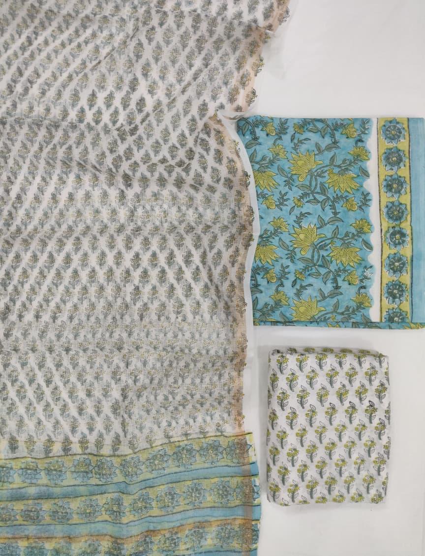 Dive into the world of artisanal textiles with our Turquoise Blossom Geometric Cotton Dress Material. This exquisite fabric showcases a delightful balance of bold geometric patterns and floral details, all hand block printed to perfection. The rich turquoise background, complemented by mustards and olive greens, reflects the vibrant spirit of Indian craftsmanship.