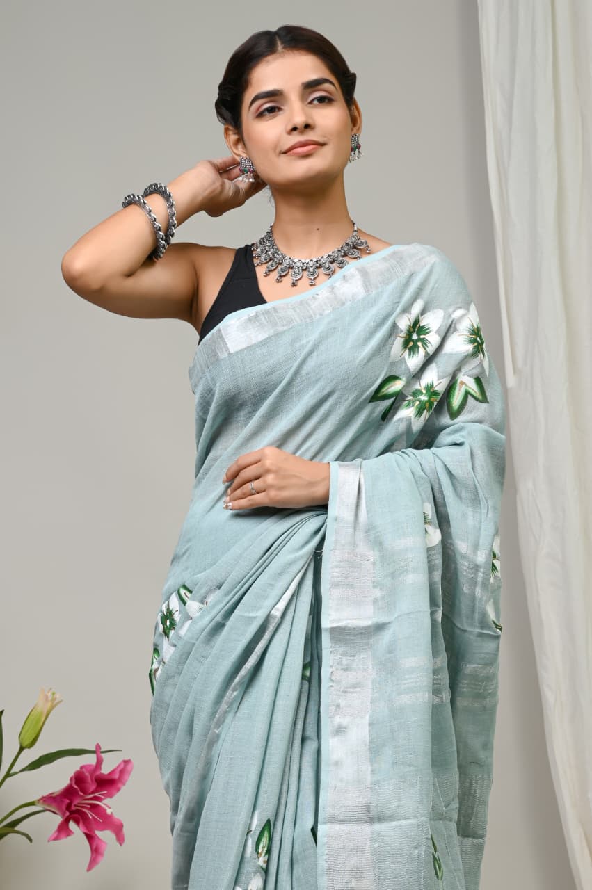 Feeling like your wardrobe needs a breath of fresh air? Look no further than the Turquoise Blossom Hand Block Printed Linen Saree, where artisanal charm meets contemporary elegance. This enchanting piece offers a soft, muted turquoise base adorned with bright white floral motifs, creating a stunning visual that’s as refreshing as it is captivating.