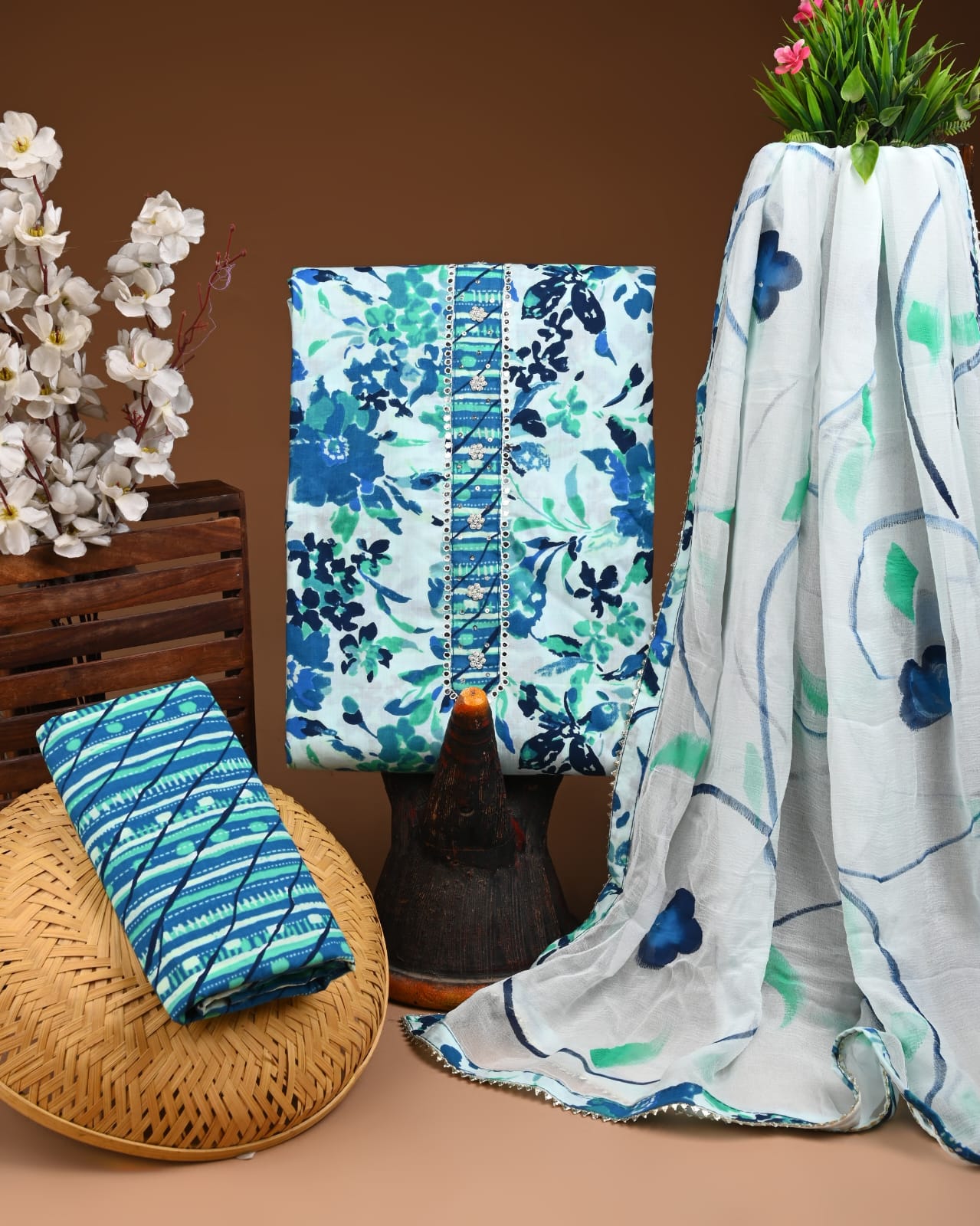 Rooted in the time-honored traditions of Indian textile artistry, this exquisite Turquoise Botanical Chiffon Cotton Suit Set showcases the beautiful interplay of floral motifs set against a soothing turquoise background. Every inch of this garment embodies the rich heritage of Jaipuri craftsmanship, with intricate gota patti work that adds a touch of opulence.