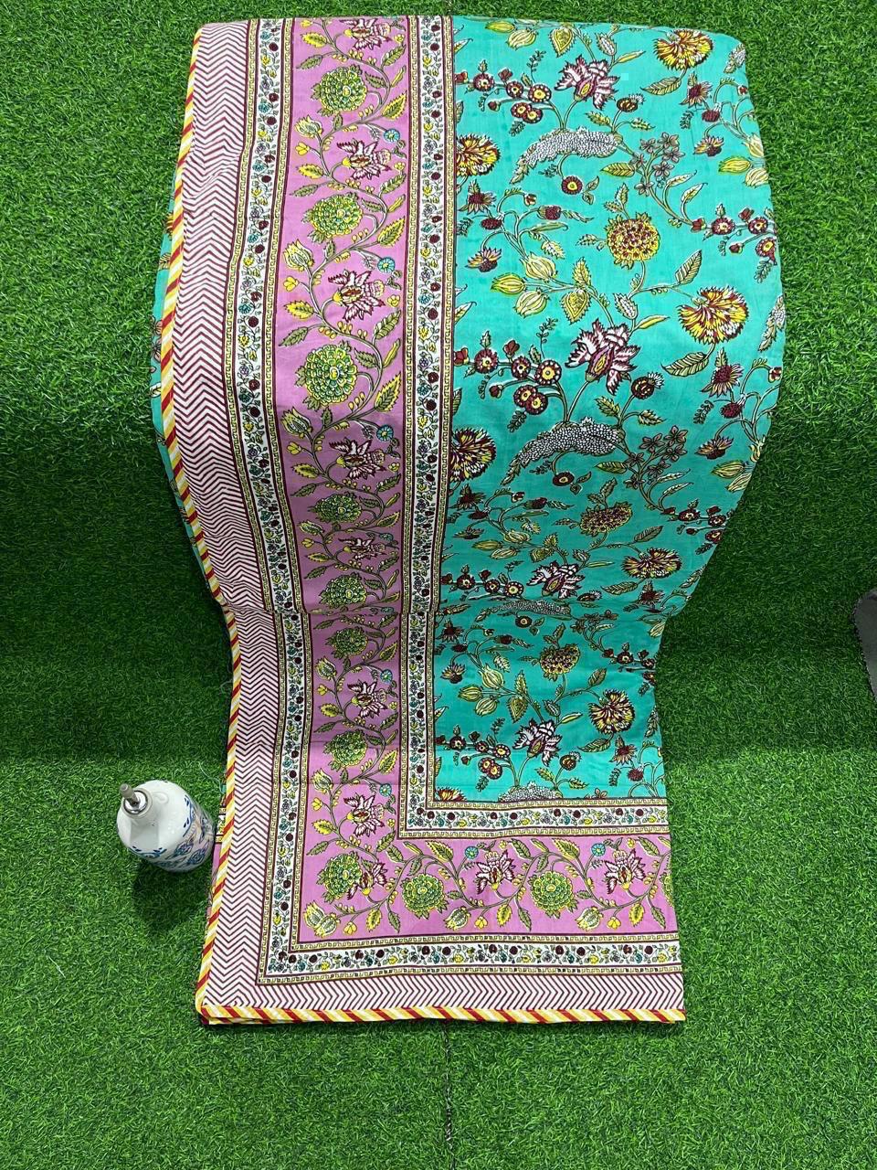 Searching for a textile that brings a burst of color and artistry into your home? This exquisite dohar features a vibrant turquoise base adorned with intricate floral motifs in soft lavender and light pink, accented by mustard yellow blooms that dance gracefully across the fabric.