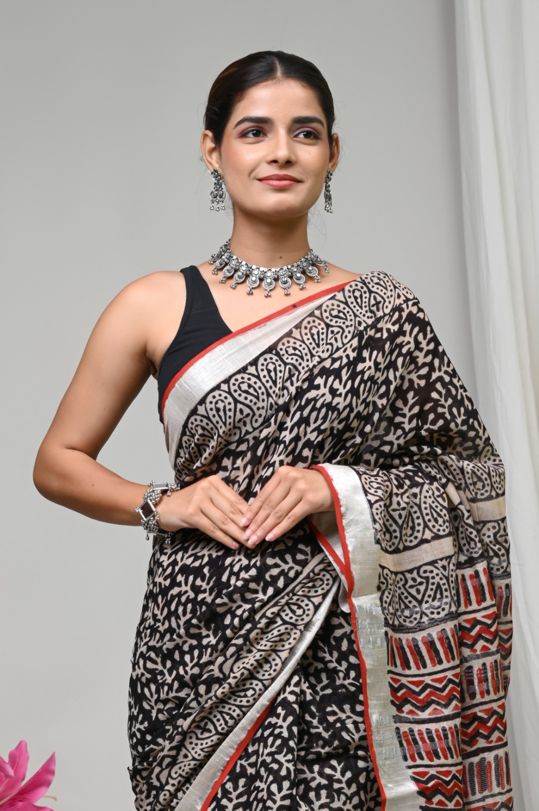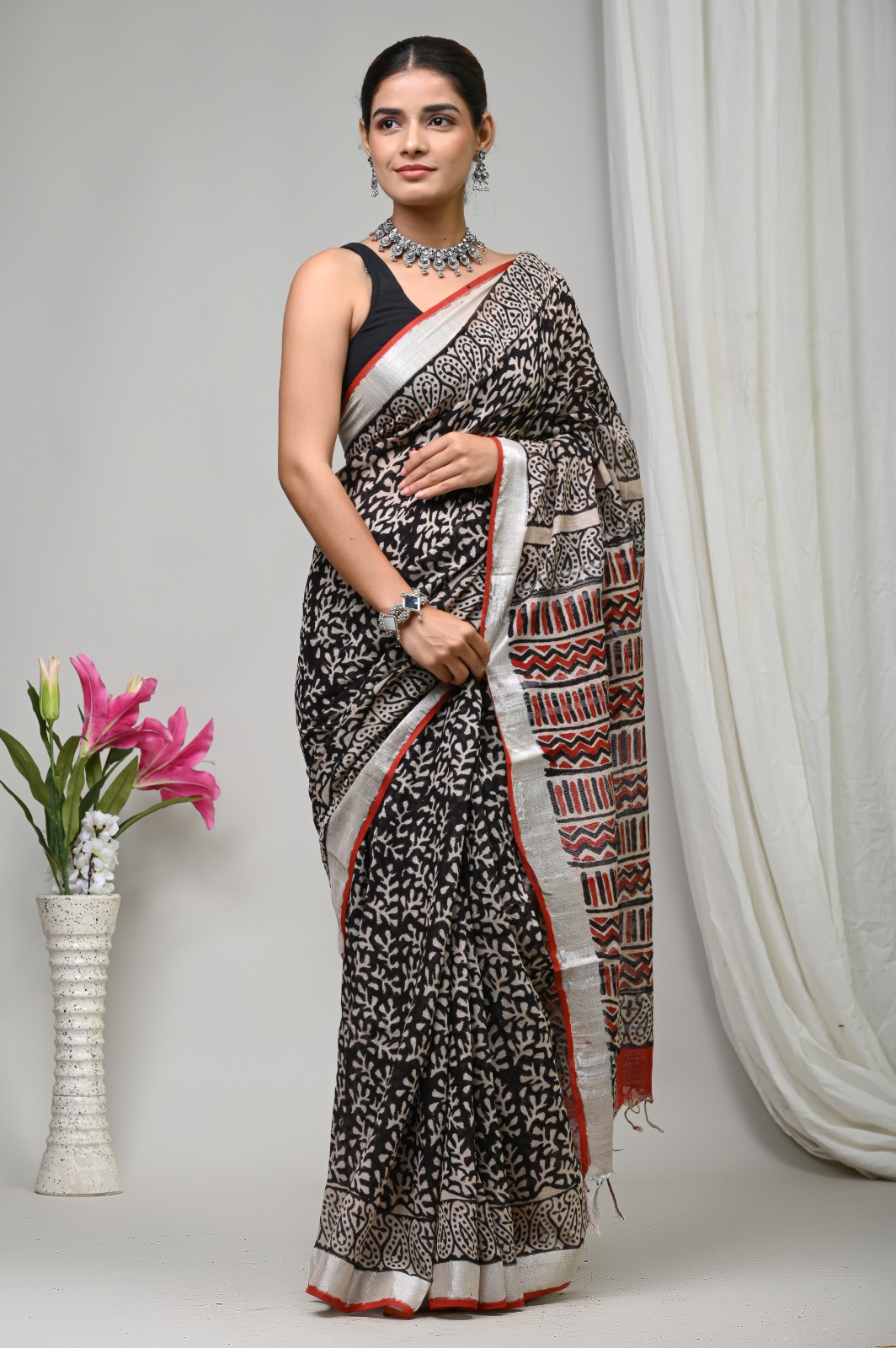 Searching for a textile that breathes artistry into your wardrobe? This exquisite turquoise floral cascade linen saree is a celebration of vibrant colors and intricate patterns, each crafted with care by skilled artisans. The soft linen drapes gracefully, allowing you to move with comfort and ease, while the delicate floral motifs add a touch of nature's charm.