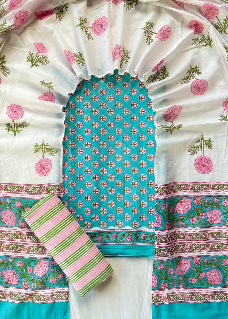 Elevate your ethnic wardrobe with this exquisite hand block printed cotton suit set from Blockart. Crafted with care, this set features a turquoise floral pattern on cotton fabric, complemented by intricate pink and green floral and geometric borders. The set includes a top, bottom, and dupatta, each 2.5 meters long, offering comfort and style. Embrace traditional craftsmanship with this premium ensemble.