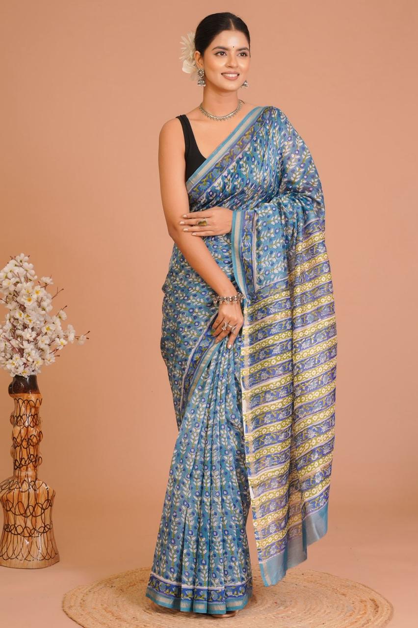 In a vibrant turquoise hue, this saree captures the essence of artistry through its intricate floral and geometric motifs. The luxurious Chanderi silk fabric offers a lightweight feel, making it a delightful choice for those special moments when you want to shine. Each piece is artisan-crafted using 100% organic dyes, ensuring a connection to nature with every wear.