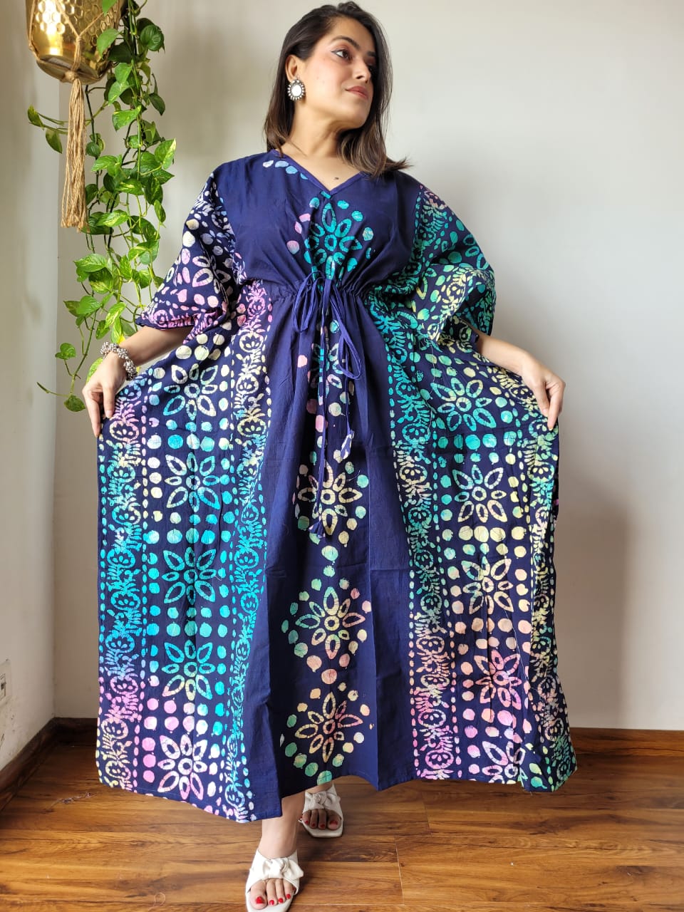 Indulge in the timeless elegance of hand block printing with our Turquoise Floral Maxi Dress. Crafted from 100% pure cotton, this free-size kaftan features a V-neckline, three-quarter sleeves, and a drawstring waist for a customizable fit. The flowy silhouette and intricate floral motifs make it perfect for casual outings or lounging in style.