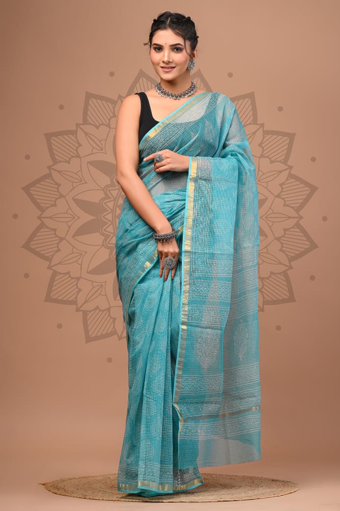 Immerse yourself in the artistry of our Turquoise Geometric Cotton Kota Doria saree, a beautiful embodiment of traditional craftsmanship. This exquisite piece features a delicate interplay of geometric patterns that evoke the essence of nature, complemented by a soft, translucent turquoise hue.