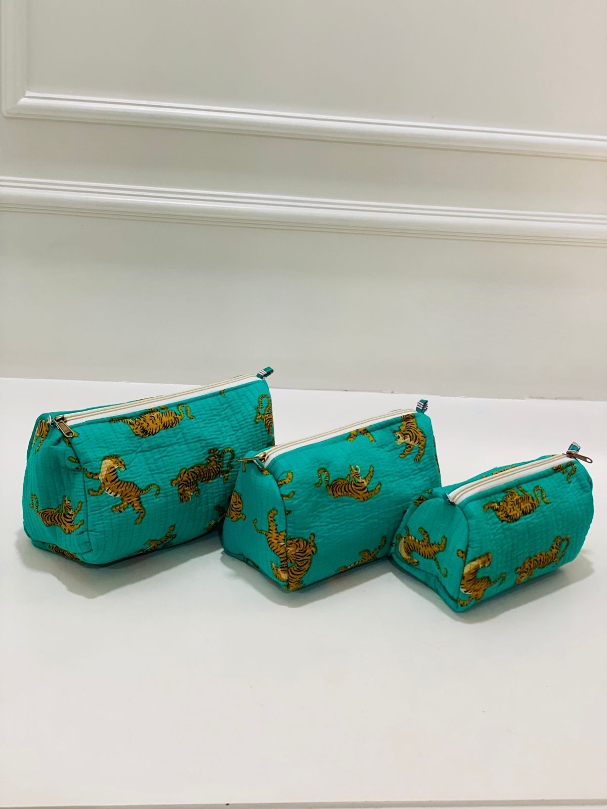 Crafted from a heavy quilted fabric, each pouch features a playful arrangement of whimsical tigers on a vibrant turquoise backdrop, splashed with golden-yellow accents. The tactile texture of the fabric adds depth, while the cheerful prints invite a sense of adventure.