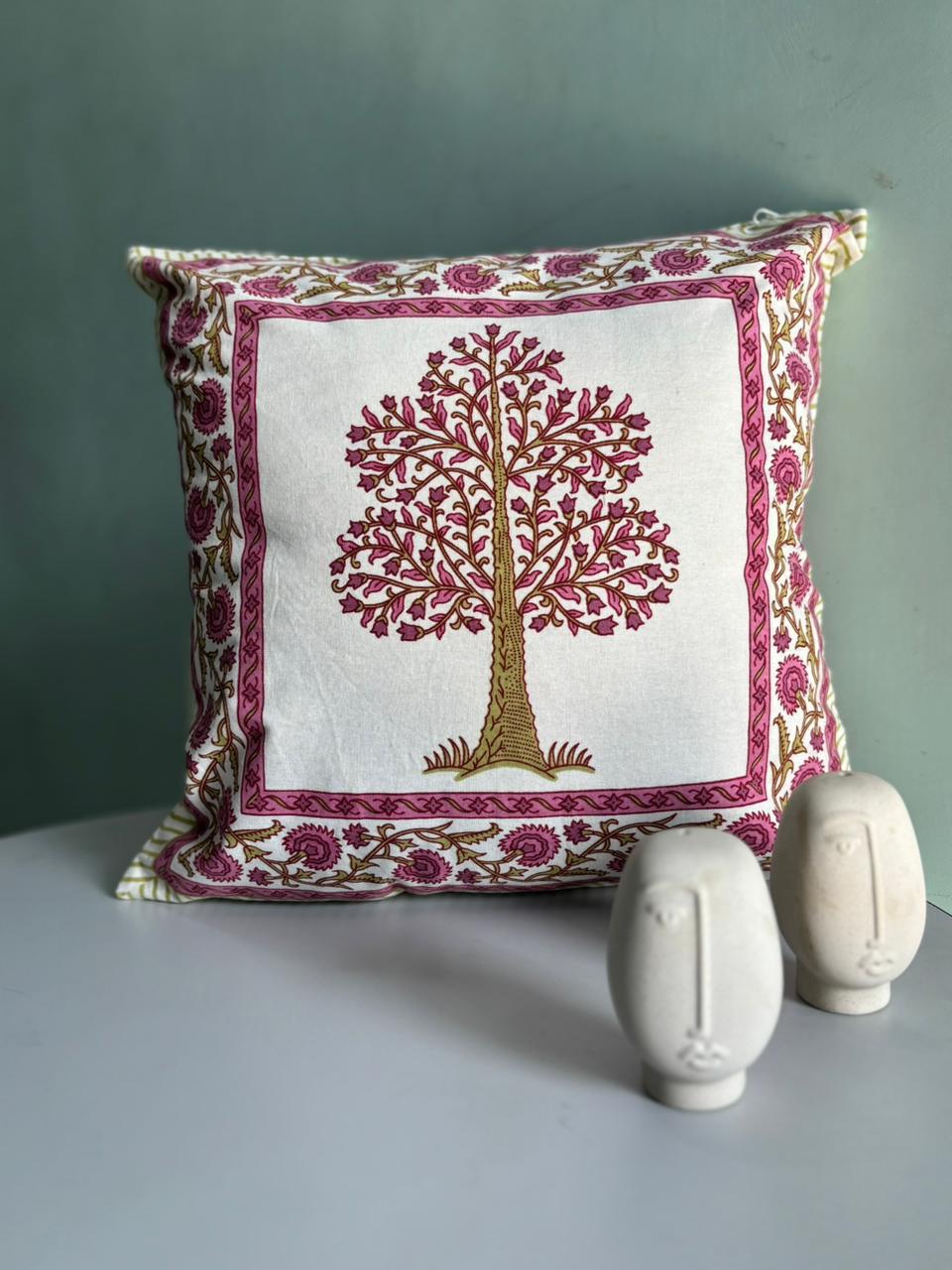 Embrace the lively spirit of Indian artistry with our Vibrant Magenta Blossom Cotton Cushion Covers. Each cover is a canvas, portraying a beautifully embroidered tree adorned with intricate floral motifs, celebrating nature's beauty. This artisan-crafted collection brings warmth and color to your living space, effortlessly harmonizing with various decor styles.