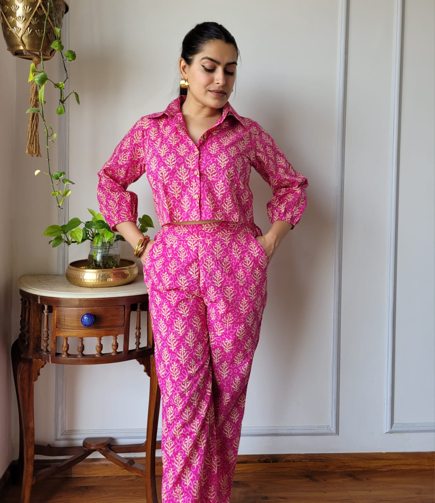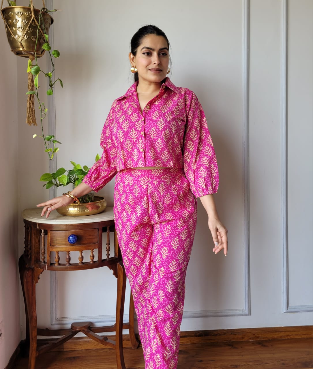 Immerse yourself in the allure of vibrant hues with our Vibrant Magenta Floral Cotton Co-Ord Set. This artisan-crafted ensemble seamlessly blends traditional Indian craftsmanship with a contemporary flair, making it a delightful addition to your wardrobe.