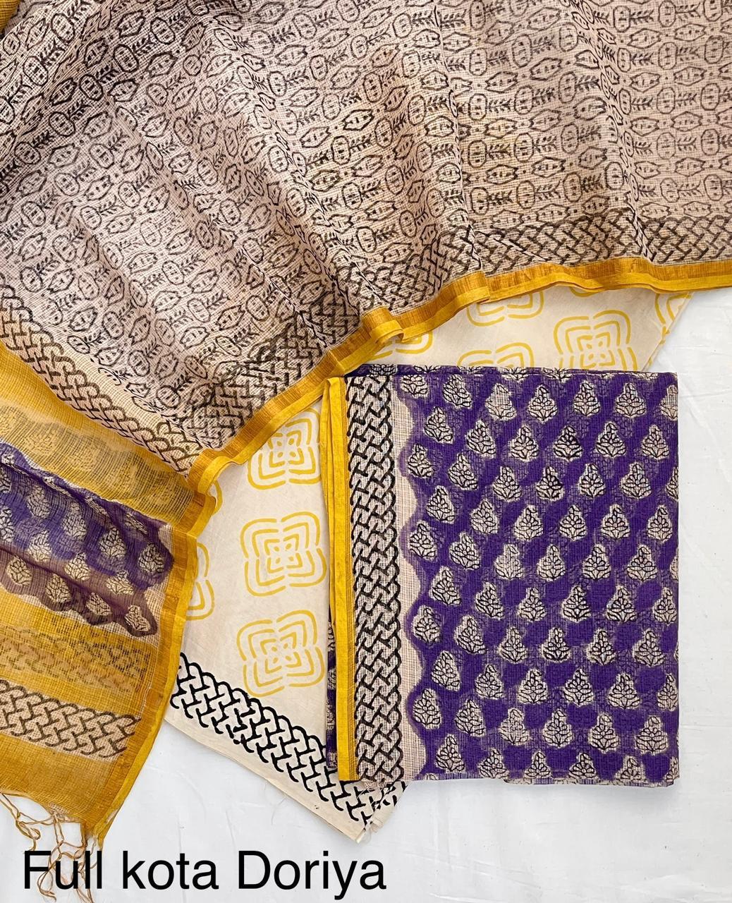 Brighten your day with this lively suit, featuring vibrant prints on classic Kota Doria fabric. Kota Doria is renowned for its lightweight, airy, and breathable properties, with a distinctive square-check weave that ensures comfort even in high temperatures. The "vibrant printed" aspect highlights the cheerful and colorful patterns that adorn the fabric. These prints can range from refreshing florals and playful geometrics to bold abstract motifs, all designed to exude a joyful and energetic feel. This suit is perfect for casual outings, daytime events, or any occasion where you want to add a cheerful and refreshing splash of color to your wardrobe.