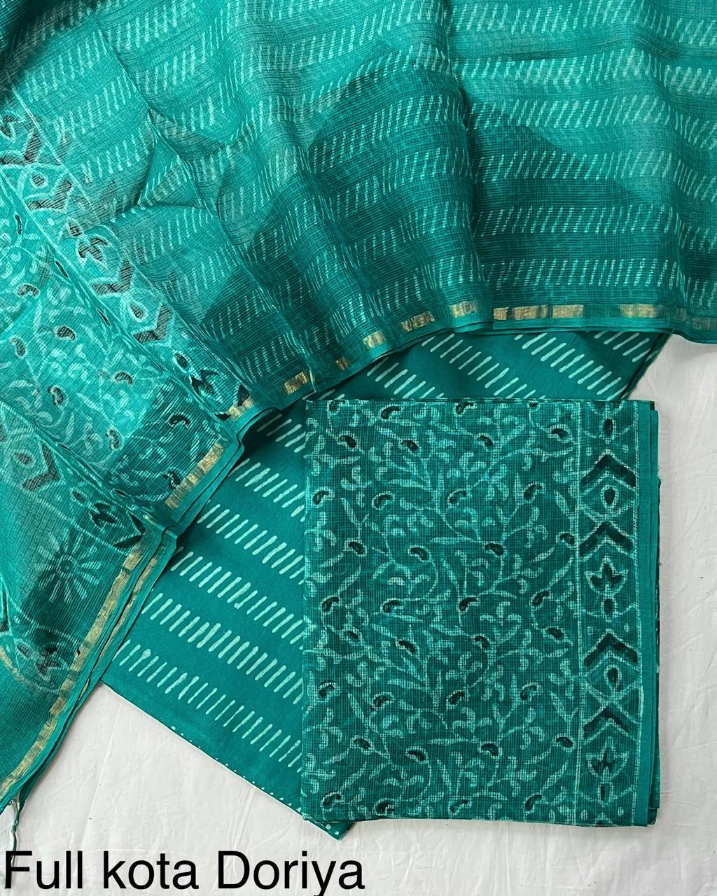 Brighten your wardrobe with this vibrant suit combo, perfectly blending the lightness of Kota Doria with the softness of silk cotton. This unique fabric mix offers a smooth drape, a subtle sheen, and exceptional breathability, making it ideal for the summer heat. The "vibrant summer" aspect implies a lively use of color, possibly featuring bold patterns, abstract designs, or lively floral motifs that pop against the fabric. The prints are designed to evoke the cheerful spirit of summer, making this suit a perfect choice for casual gatherings, garden parties, or any occasion where you want to add a splash of color and comfort.