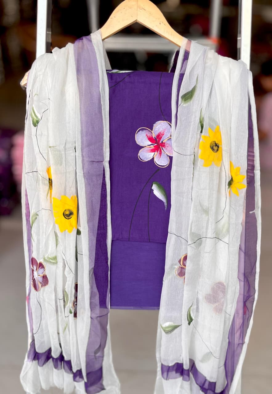Delve into the rich tapestry of Indian textile artistry with our Violet Blossom Floral Cotton Suit Set. The deep violet backdrop serves as a canvas for delicate floral motifs, capturing the essence of nature's beauty through traditional block printing techniques. Each piece is a testament to the skilled artisans who pour their heart into every detail, ensuring a garment that’s not just worn, but cherished.